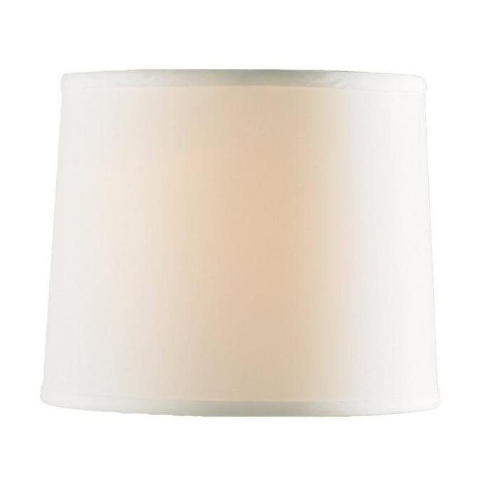 White linen drum shade. Made in the USA. Silver hardware, washer fitting and narrow trim top and bottom. (9"x10"x8"). 100 watts max.