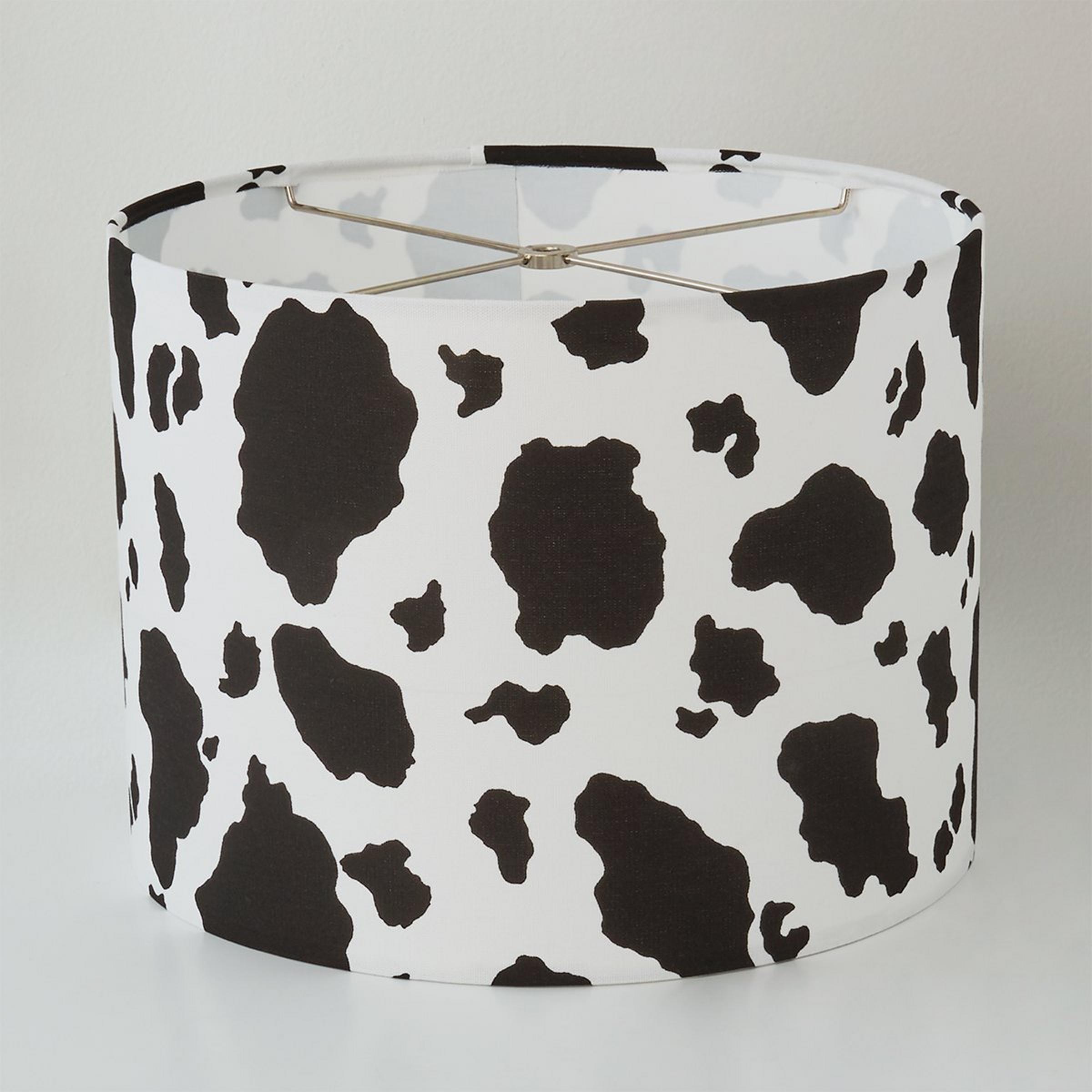Taking cues from the fashion world, cow print is back! This simple drum shade is the perfect way to add a small flourish of this trendy pattern into your space without breaking the bank. This drum shade is perfect on a simple lamp or even for making a swag pendant over a table. This shade is made by hand in our Richmond, Virginia production facility by one of our skilled crafts people.