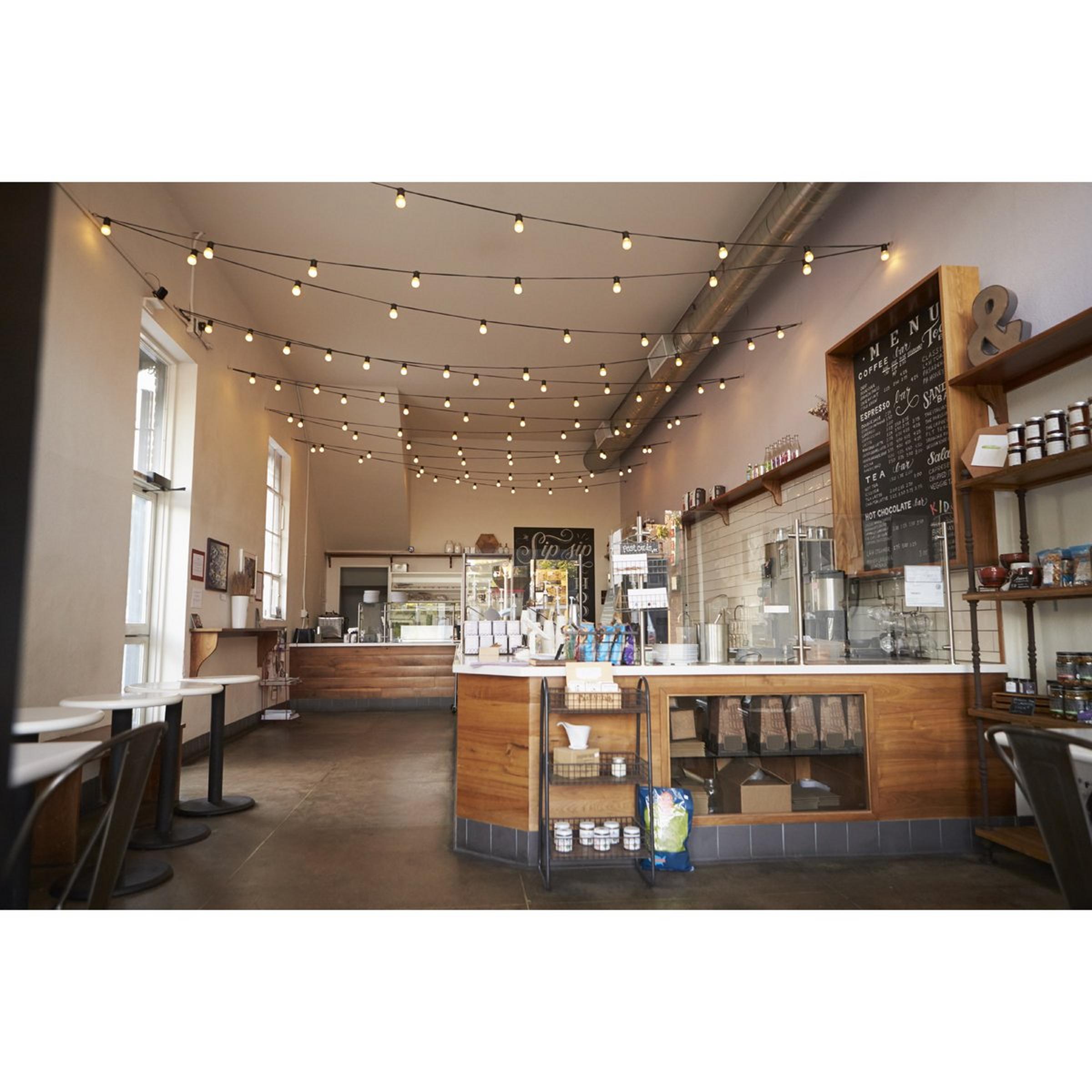 Single 14-foot-long black string light with ten G16 bulbs for the corresponding sockets These string light bulbs are safe to use both indoor and outdoor. Perfect for patio lighting, gazebos, porches, outdoor events, parties, restaurants, weddings, living rooms, bedrooms, and more. Connect up to 7 strings. Fully dimmable.