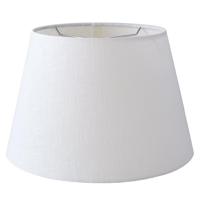 150 watts. Top: 11"; Bottom: 16"; Side: 11". Washer fitting. White or Beige Linen. Rolled edge drum for a clean look.