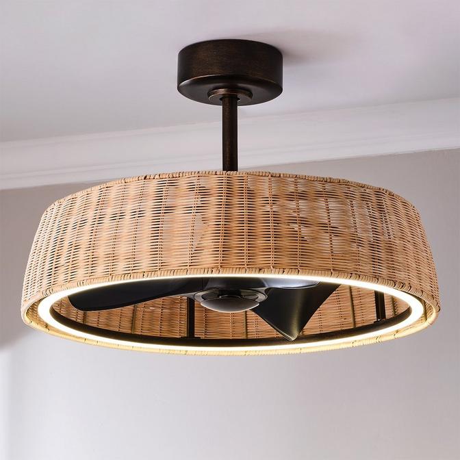 Combining the look of handcrafted rattan with warm distressed bronze, this leading-edge fan blends in seamlessly with your outdoor space. A great choice for open-air porches, this fan is treated to prevent weather damage. Optimized with Wifi connectivity and contemporary integrated tunable LED technology.