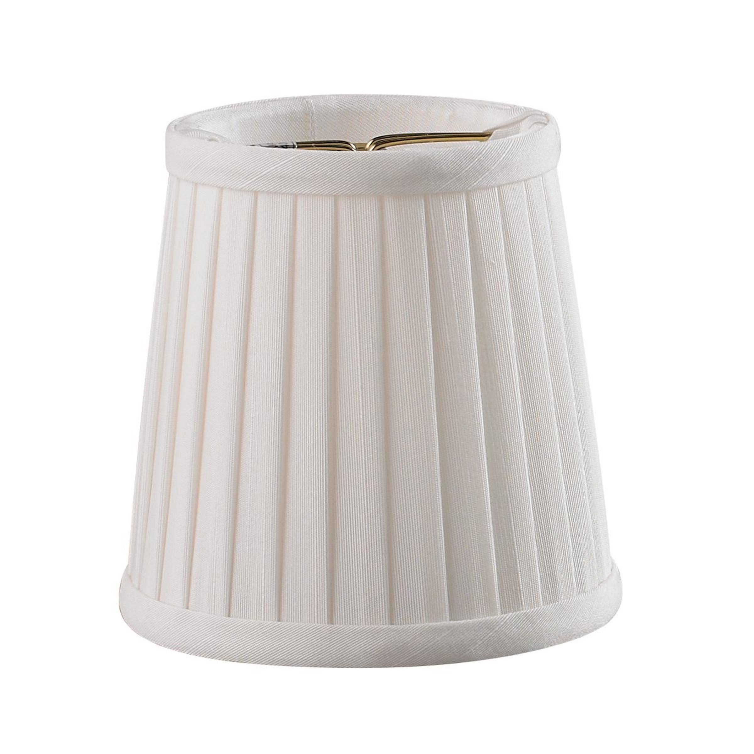 These chandelier mini pleated deep drum style softback shades are made of tissue Shantung material with self trim top & bottom and are available in the following colors: Off White, Eggshell, & Black. Our Off White & Eggshell color shades are lined in off white color satin material, and our Black color shades are lined in double gold satin material. Measures 3 inch top by 4 inch bottom by 4 inch overall height. Candle Clip style fitter with flush recess from the top. 25W max.