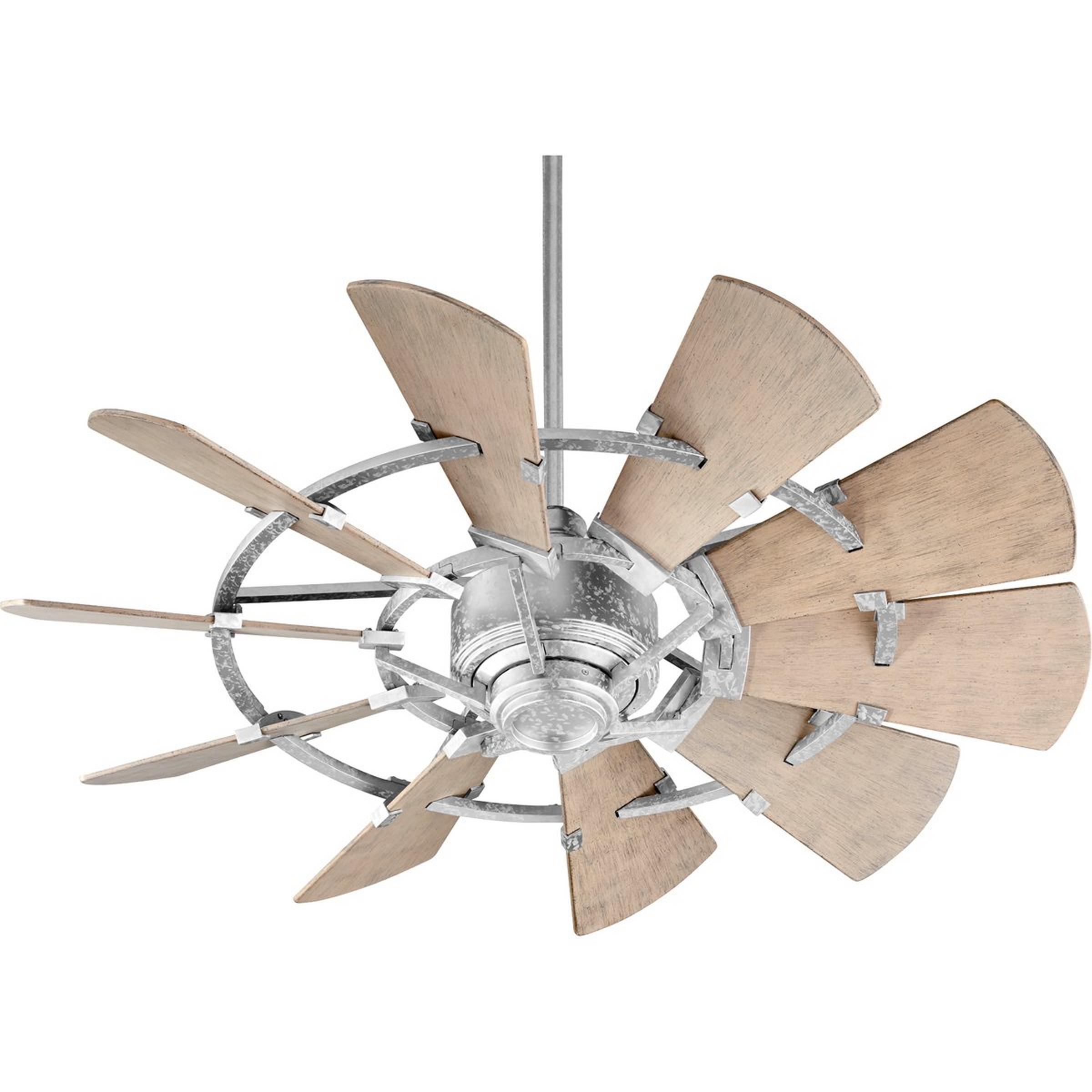 This stunning rustic ceiling fan utilizes fifteen dramatically tilted blades channeling the design of a windmill. ABS blades with a wood-look weathered oak finish add country chic charm to this striking design.