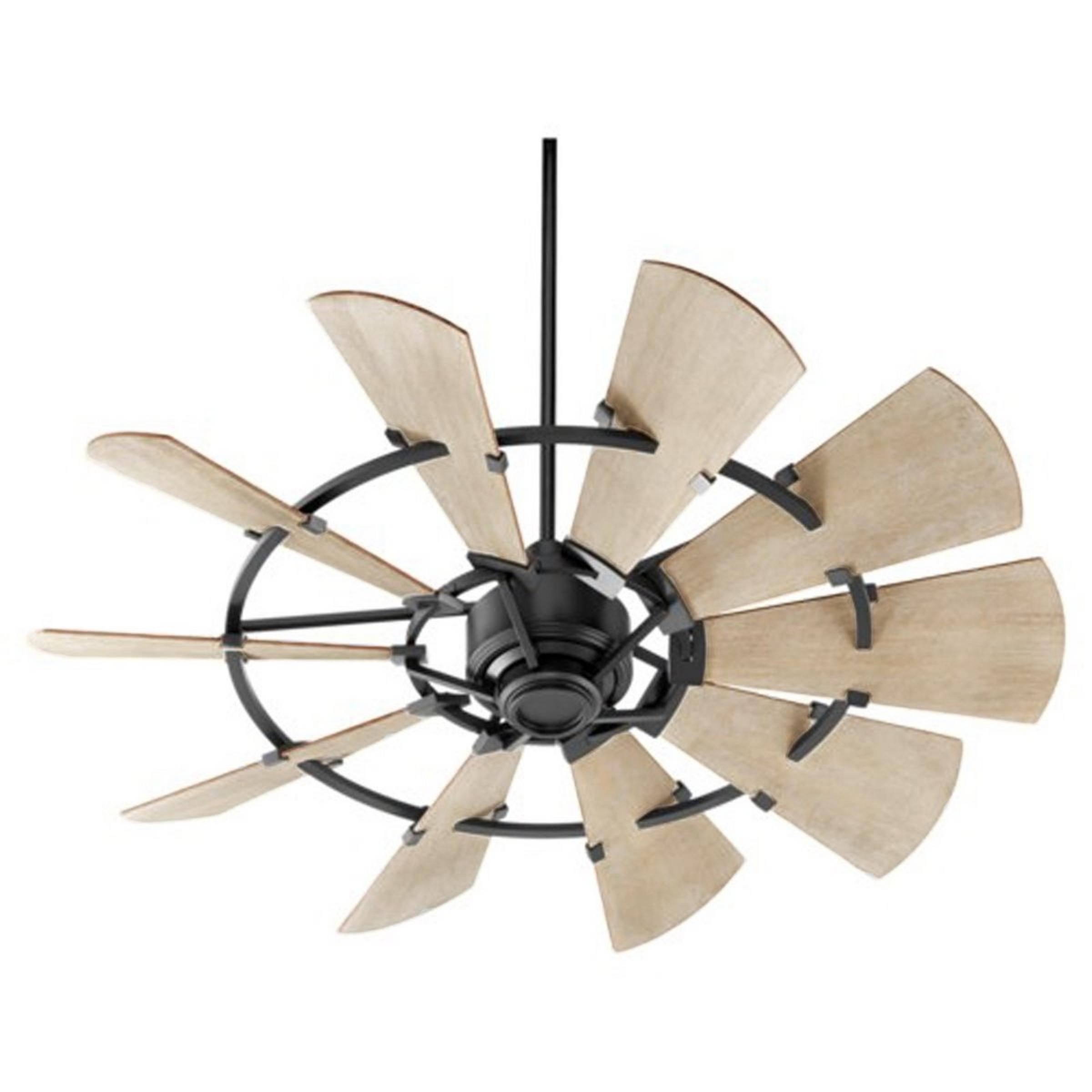 This stunning rustic ceiling fan utilizes fifteen dramatically tilted blades channeling the design of a windmill. ABS blades with a wood-look weathered oak finish add country chic charm to this striking design.