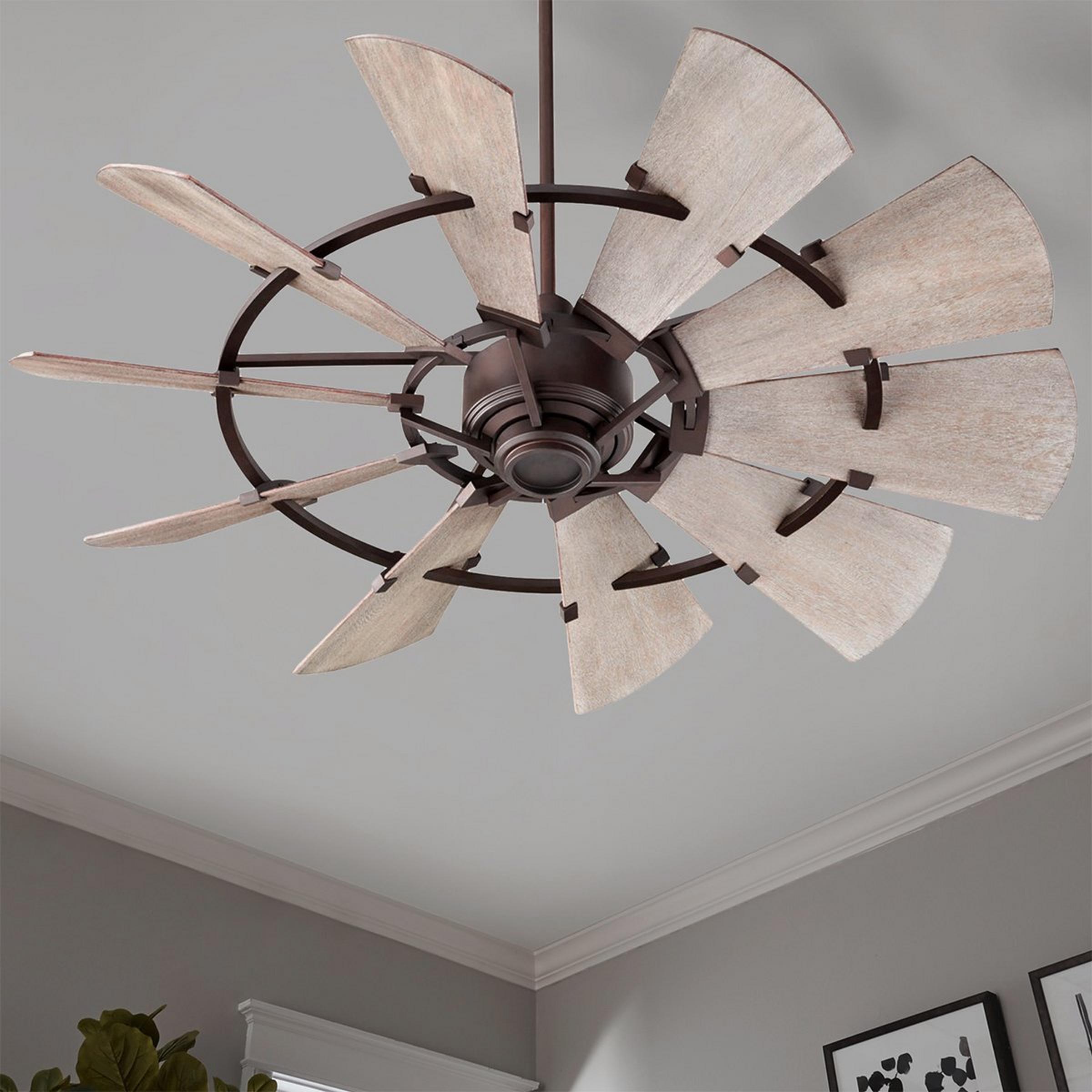 This stunning rustic ceiling fan utilizes fifteen dramatically tilted blades channeling the design of a windmill. Wood blades with weathered oak finish add country chic charm to this striking design.