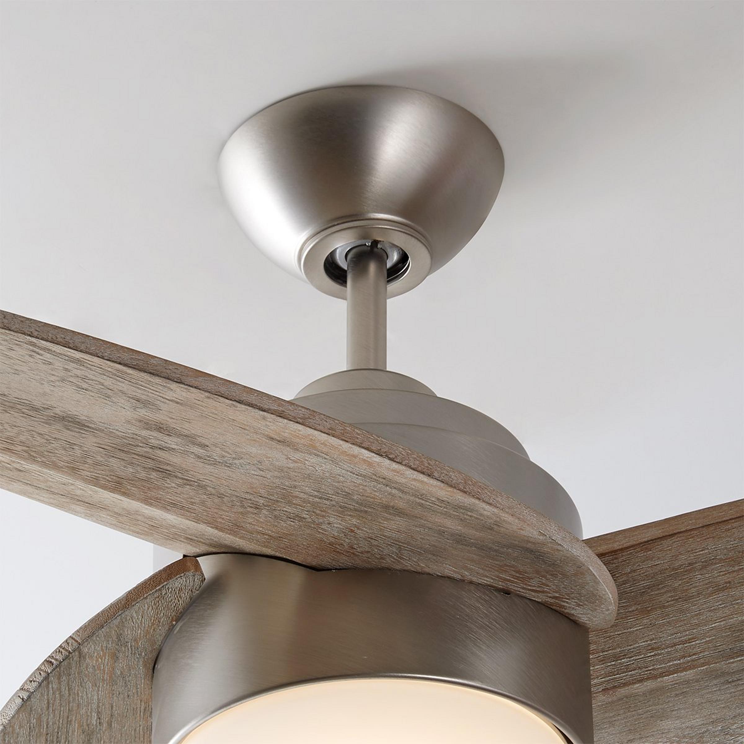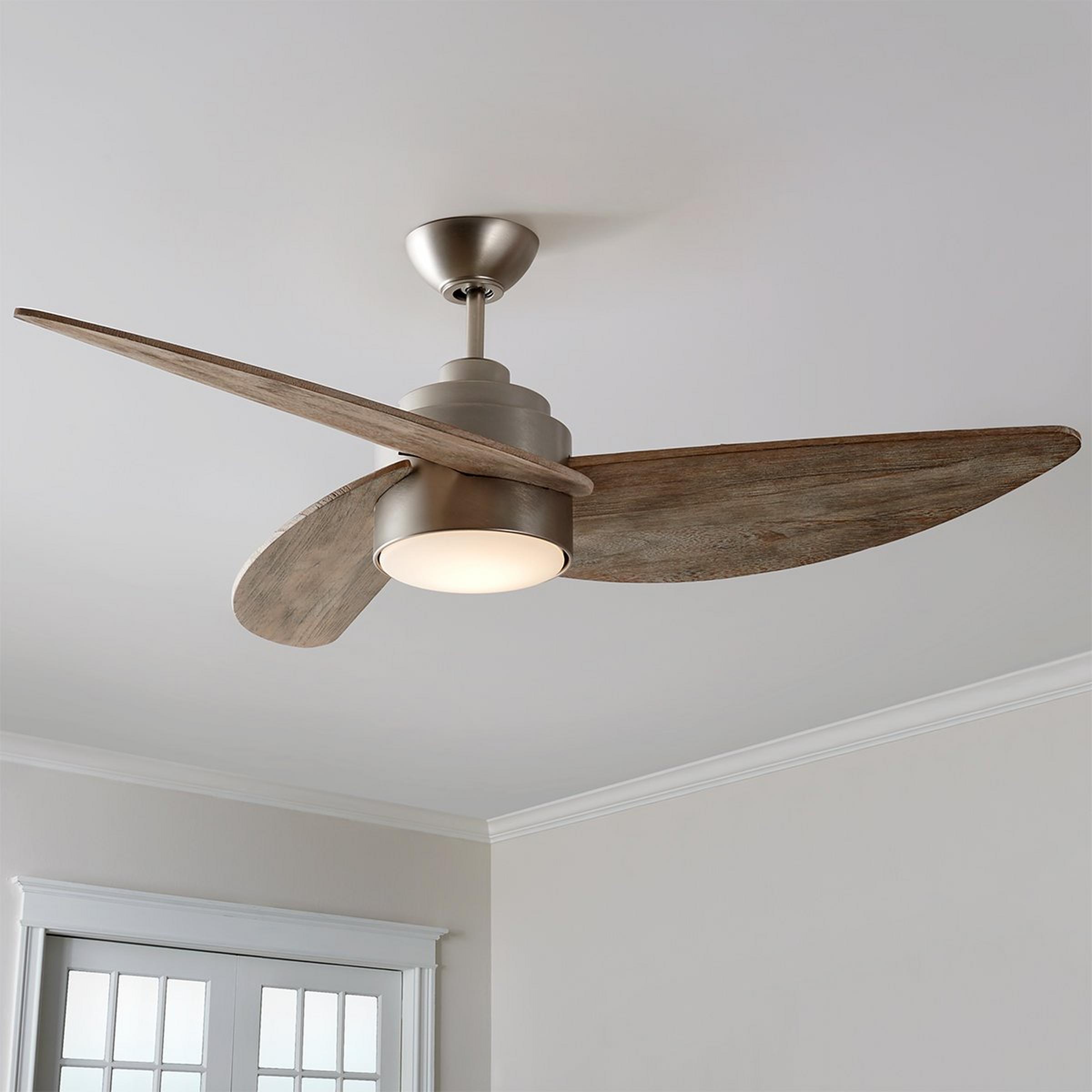 Our Whirligig Ceiling Fan lends a light and refreshing look to update your living room or bedroom. The weathered oak rounded blades and sleek hardware will incorporate a much-needed aesthetic that also offers the function to brighten your area as well as offer an efficient airflow. Its personality has a softness that will blend effortlessly into your space. Due to the fan's real wooden blades, no two will be alike with variations in wood tone.