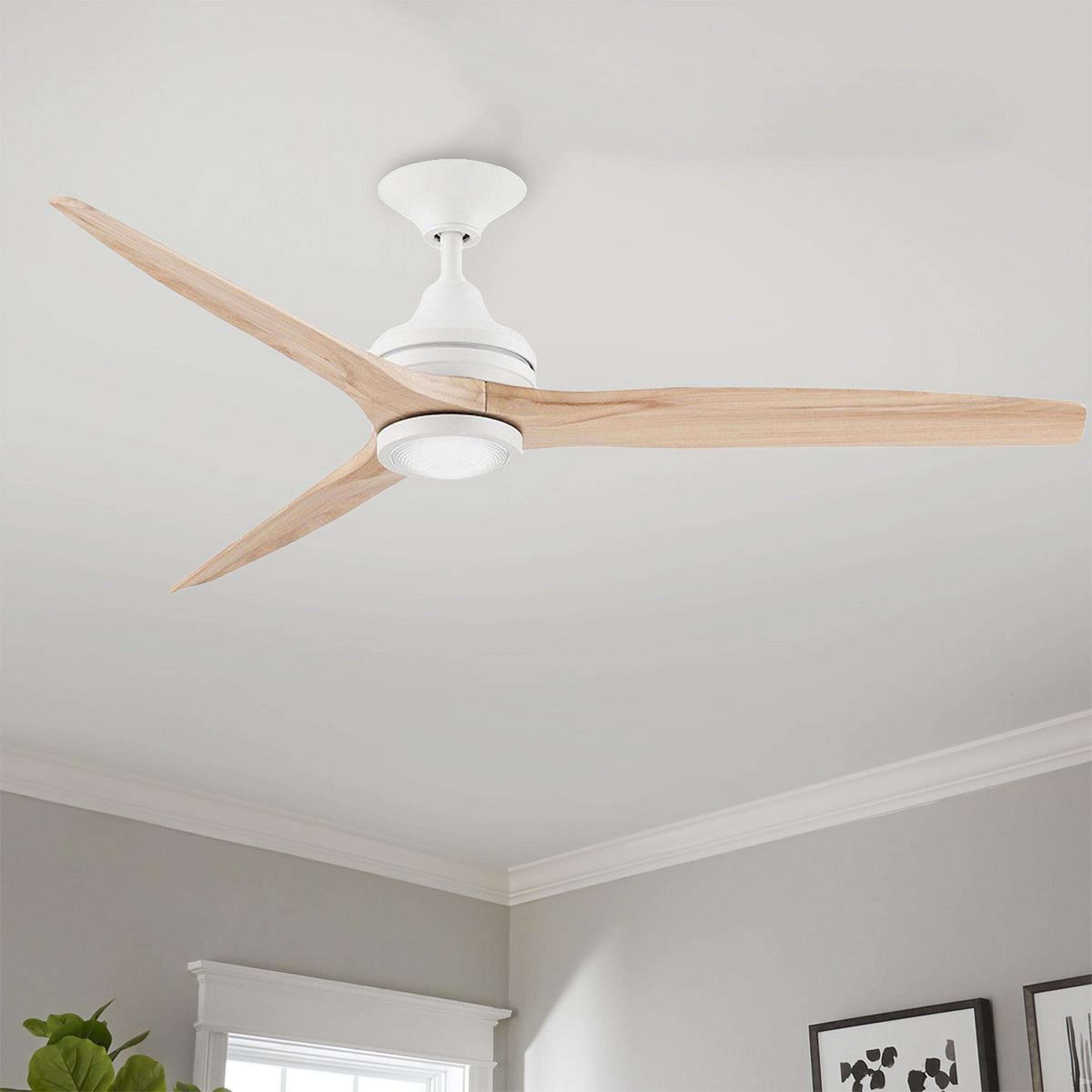 Modern 60" indoor & outdoor LED ceiling fan with wood blades, handheld remote, and 3 speeds. Quiet, dimmable & ideal for living rooms, patios, and porches.