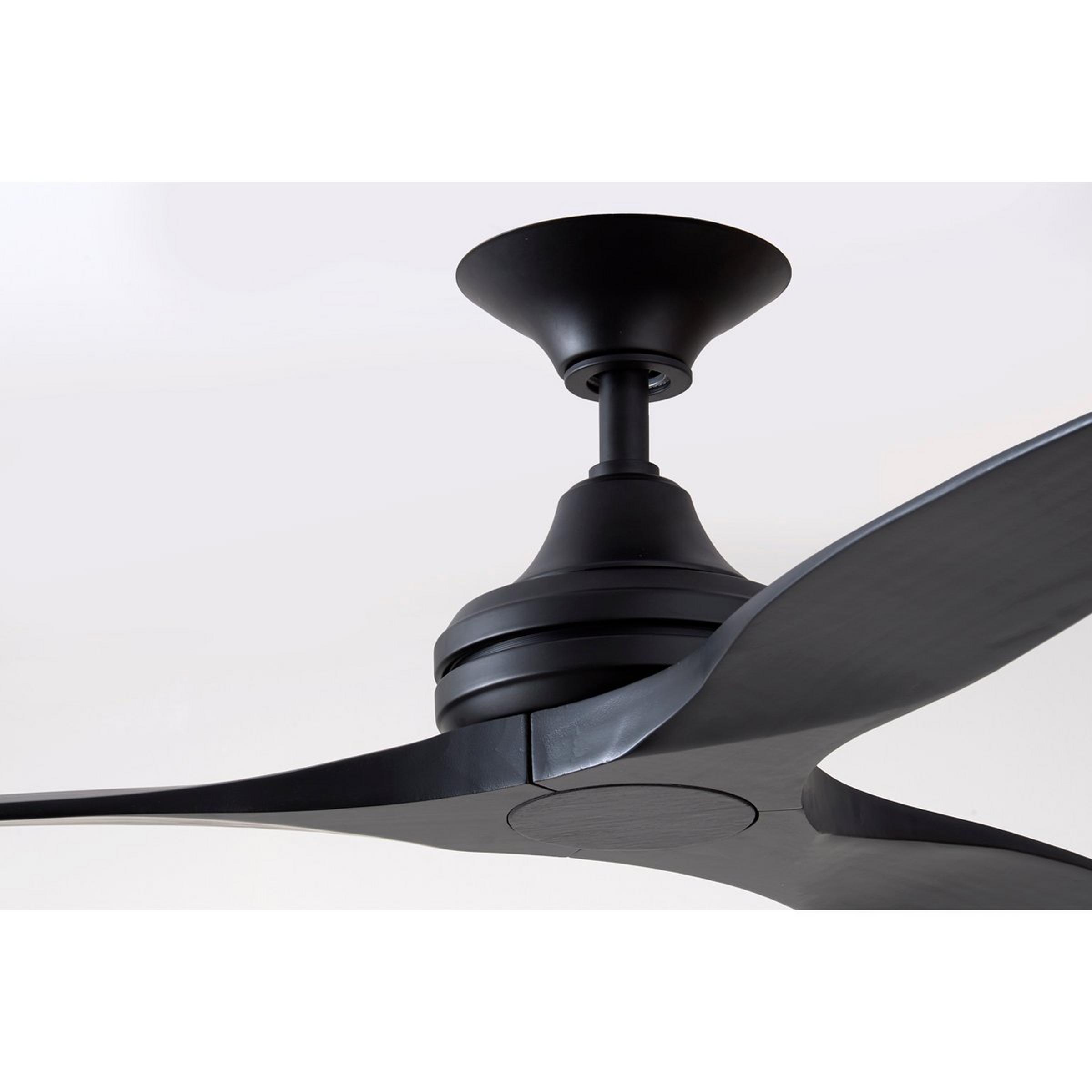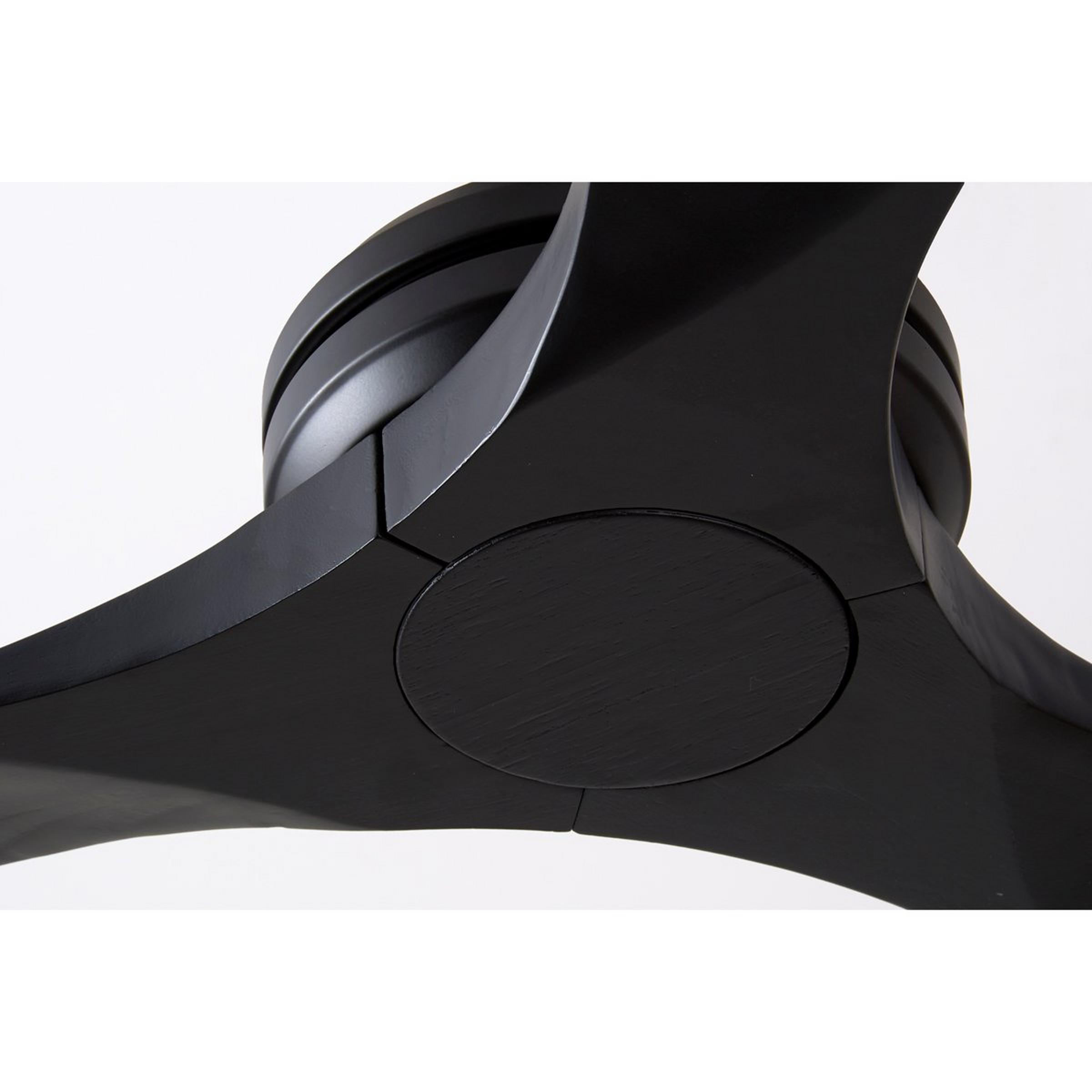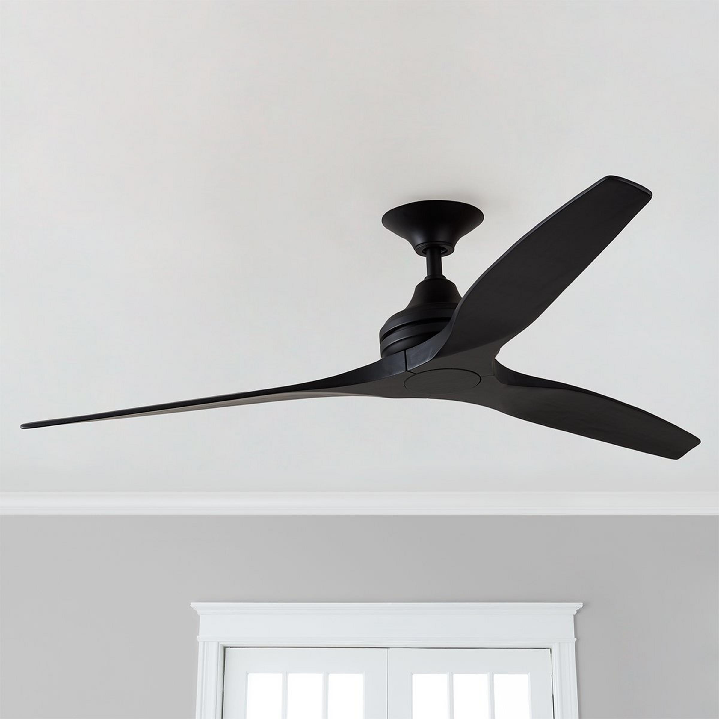 This quiet indoor/outdoor metal and wood ceiling fan showcases a modern three blade design that embraces an artistic balance of cutting-edge technology, beauty, and modern design. Three forward and three reverse speeds can be controlled by a handheld remote; the reverse switch is located on the fan motor. Sloped ceiling compatible up to 19 degrees, this fan suits a variety of indoor spaces, like living rooms, and outdoor spaces like patios and porches. Optional sloped ceiling ball kits are available for slope angles up to 42 degrees. Minimum hanging clearance is 7 ft. Wood blades feature natural variation.