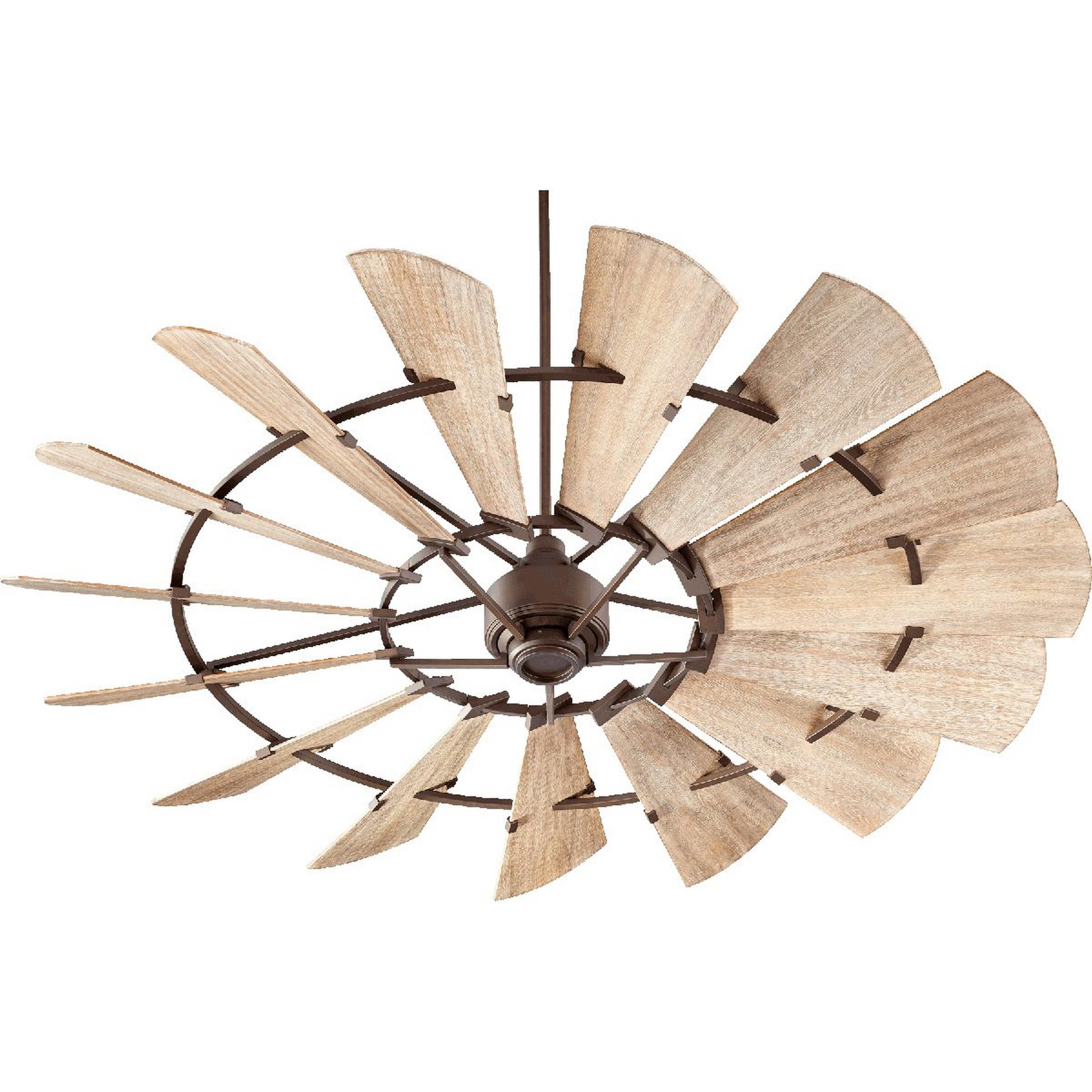 This stunning rustic ceiling fan utilizes fifteen dramatically tilted blades channeling the design of a windmill. ABS blades with a wood-look weathered oak finish add country chic charm to this striking design.