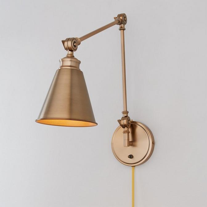 This classic adjustable swing arm wall sconce, with a traditional jointed arm capped in a sleek cone shade, merges style and functionality for the perfect task lighting solution for refined spaces. Moves up and down and side to side.