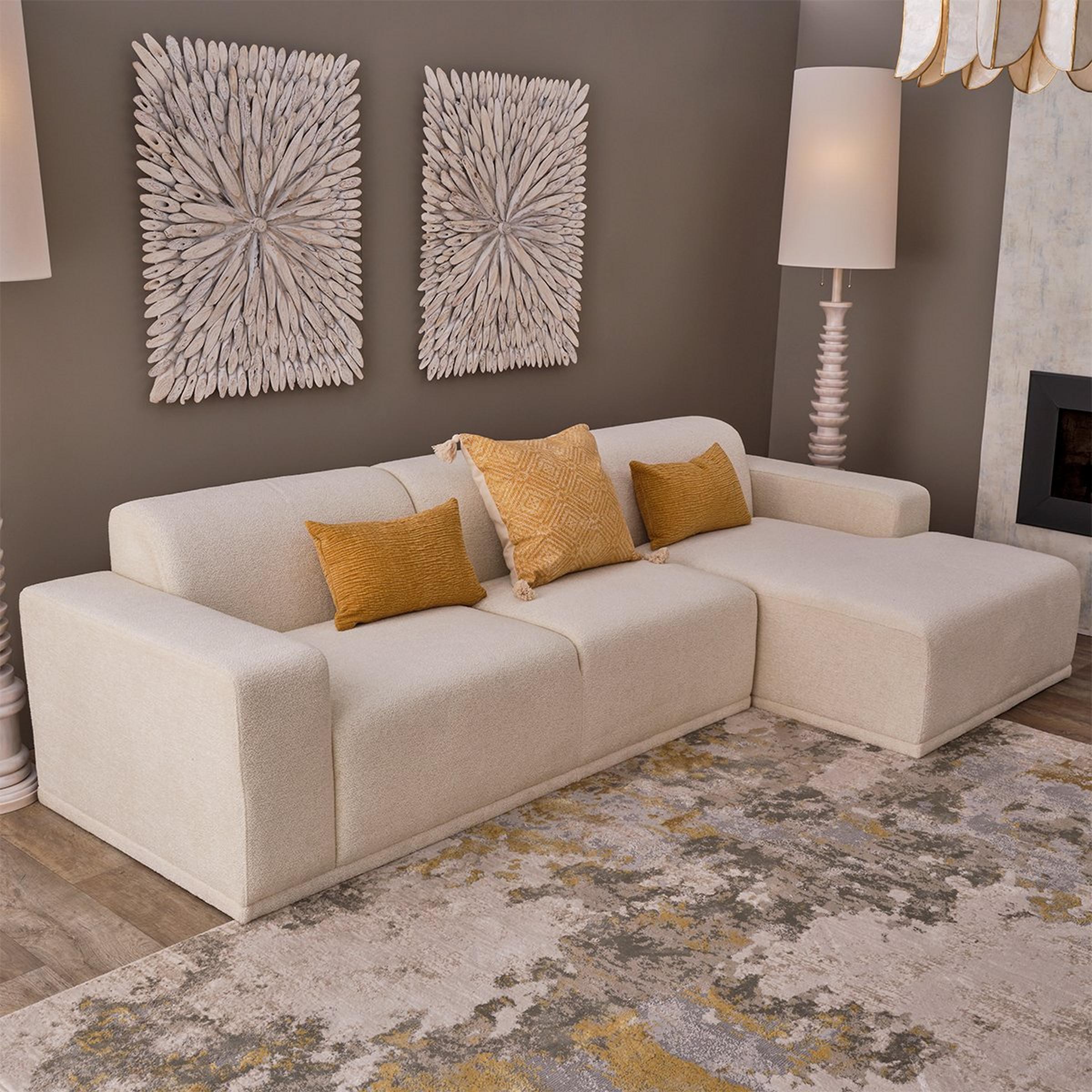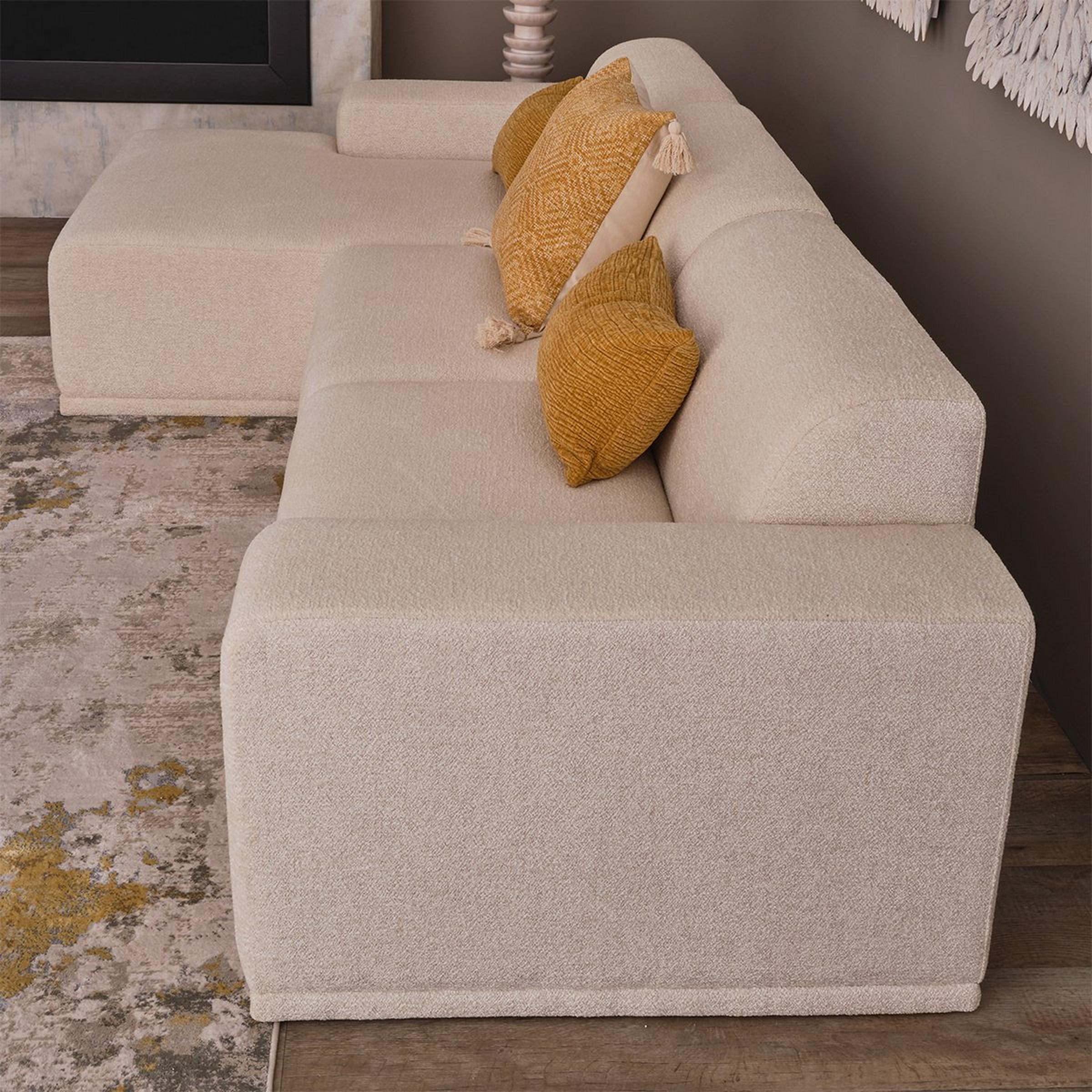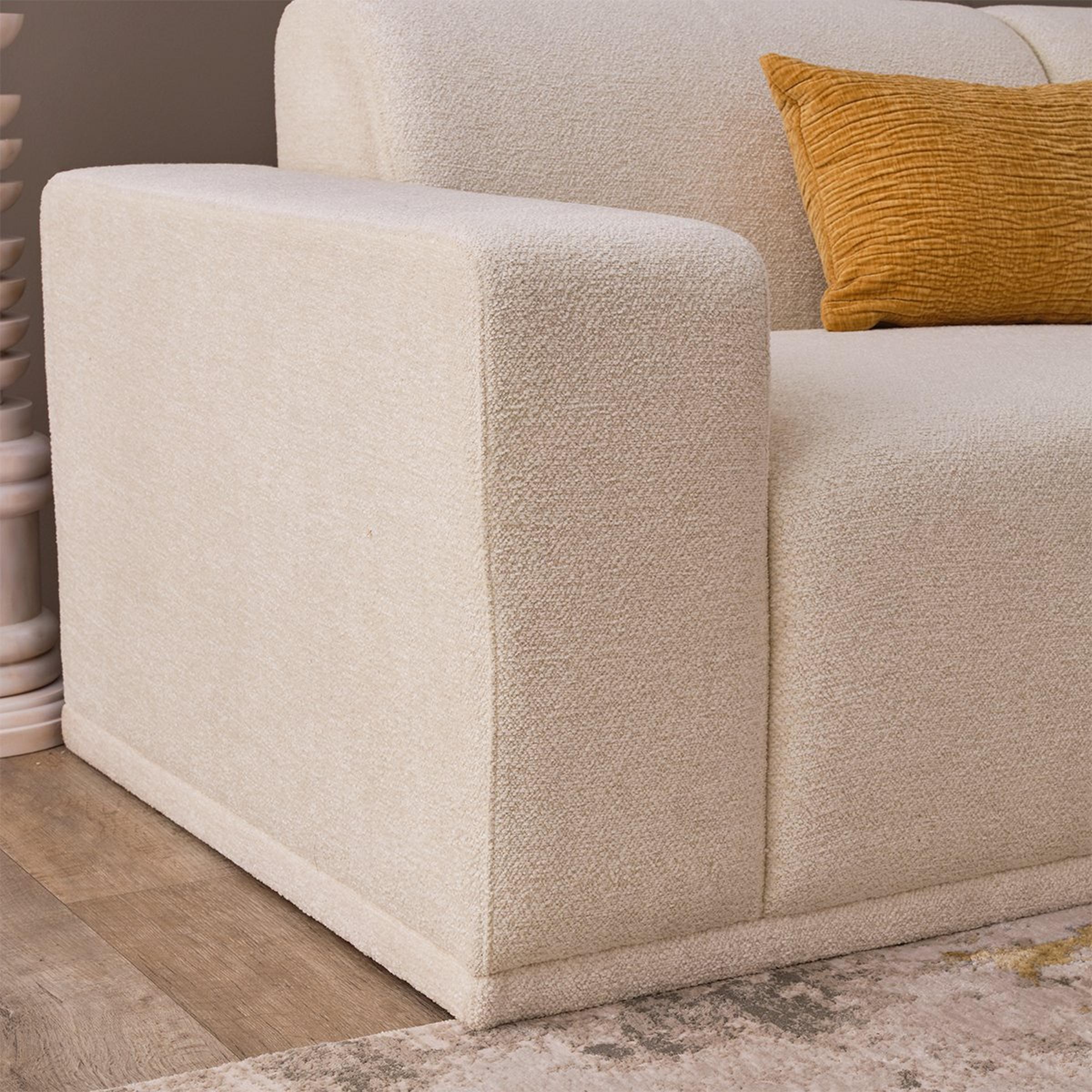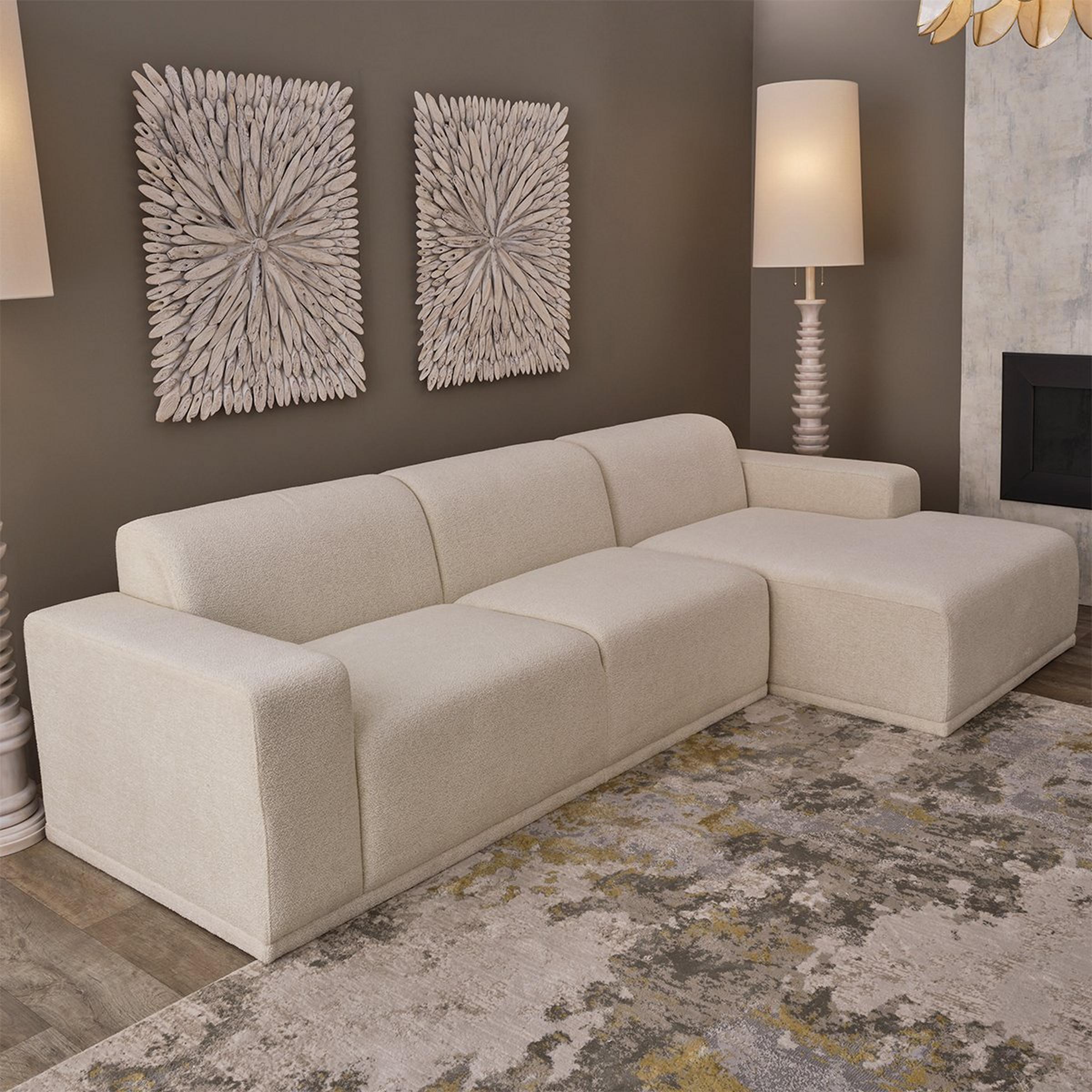With a minimalist and low-profile silhouette, this modern sectional sofa is a stunning and unpretentious piece for your home. Not just stylish but functional as well, this sofa features durable coconut white textured upholstery and a cleat system to secure the two sectional pieces together.