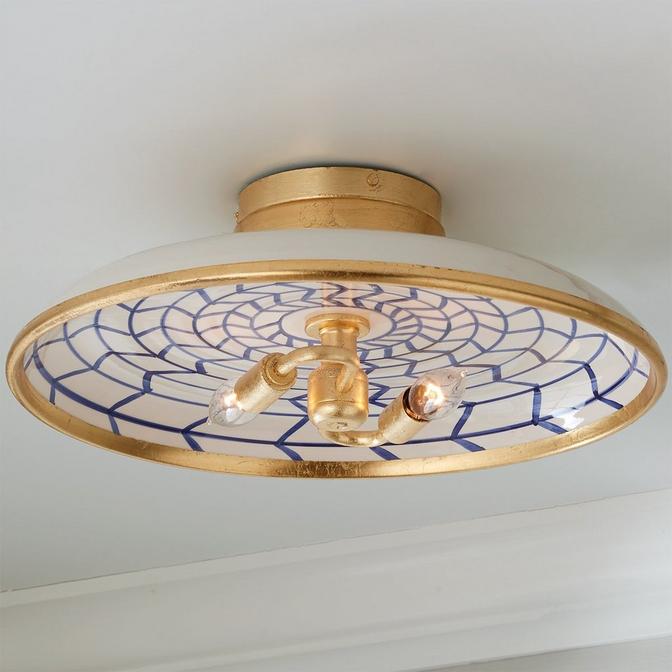 Reminiscent of an Ancient Greek artifact with it's lush 18k gold leaf on the ceramic that is hand made in Italy and striking blue accents this cream stoneware light is a great way to add a dramatic accent in any space. This ceiling light is assembled by hand in our Richmond, Virginia production facility.