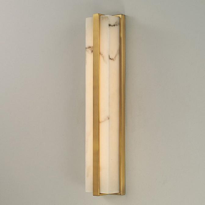 This light's elongated slab of alabaster radiates a warm, inviting light from within its elegant frame, casting a serene glow that accentuates the stone's distinctive natural veining and color. This harmonious combination showcases the beauty of the material while enriching your space with an ambient glow. This vanity light's luxurious feel originates from its simple silhouette and evokes a tranquil atmosphere. A perfect piece to brighten a bathroom, this light's versatility shines when styled as ambient light in any room.