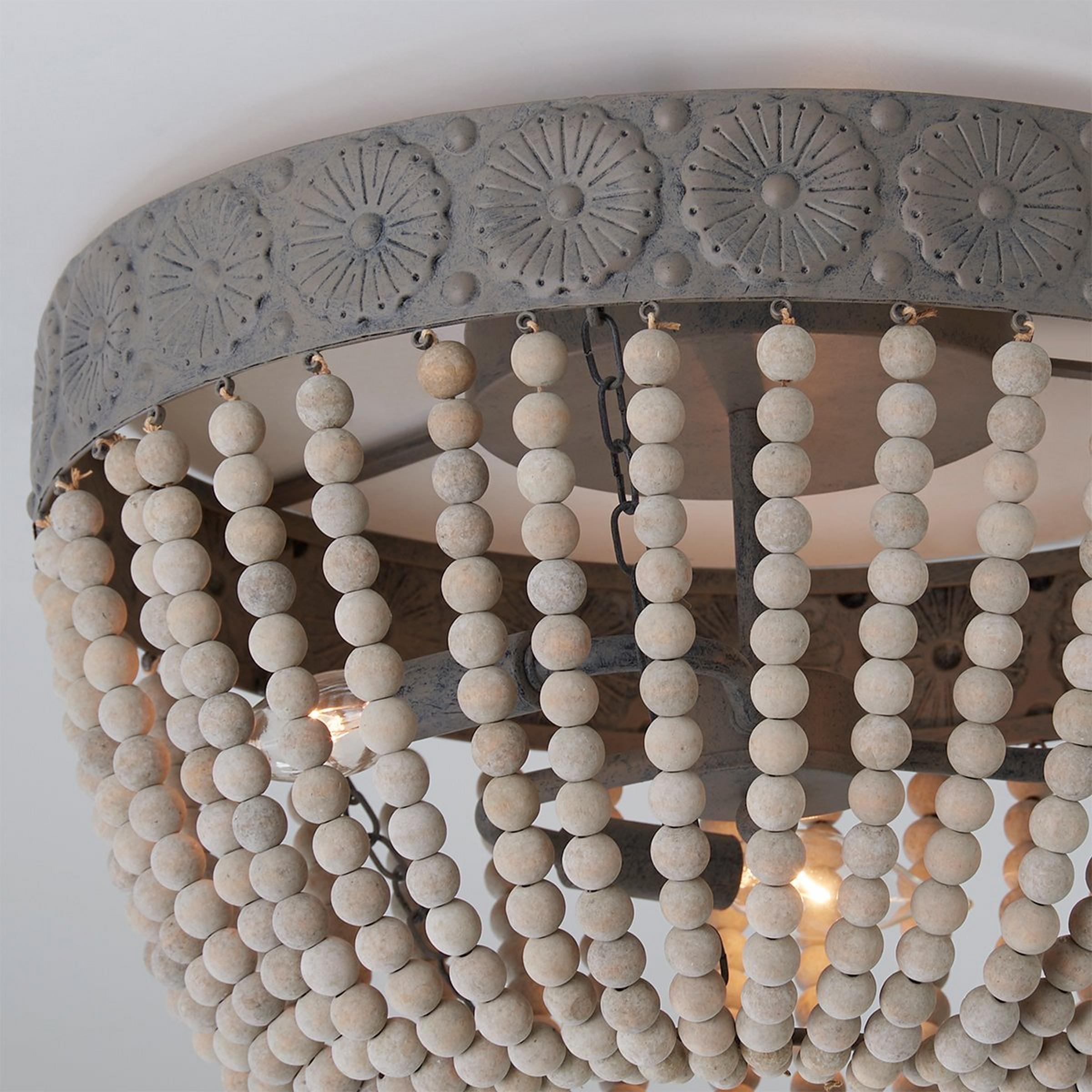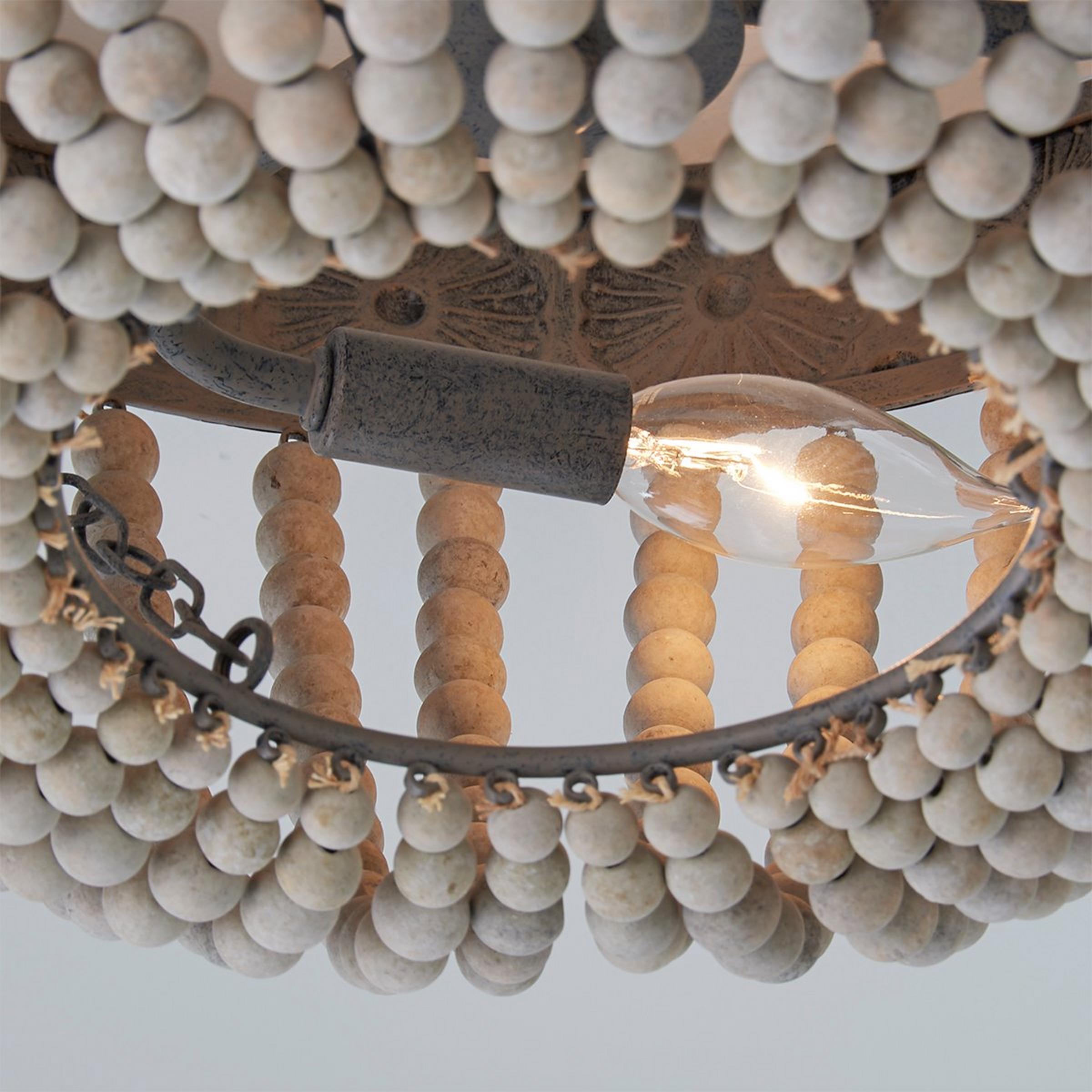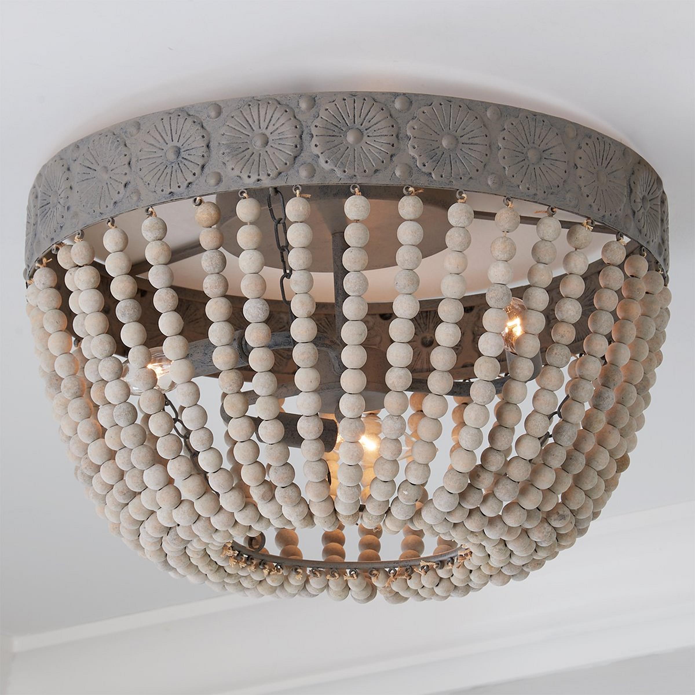 Classic style meets rustic charm with this distressed flush mount ceiling light featuring a dome-shaped basket of weathered gray wash wooden beads.