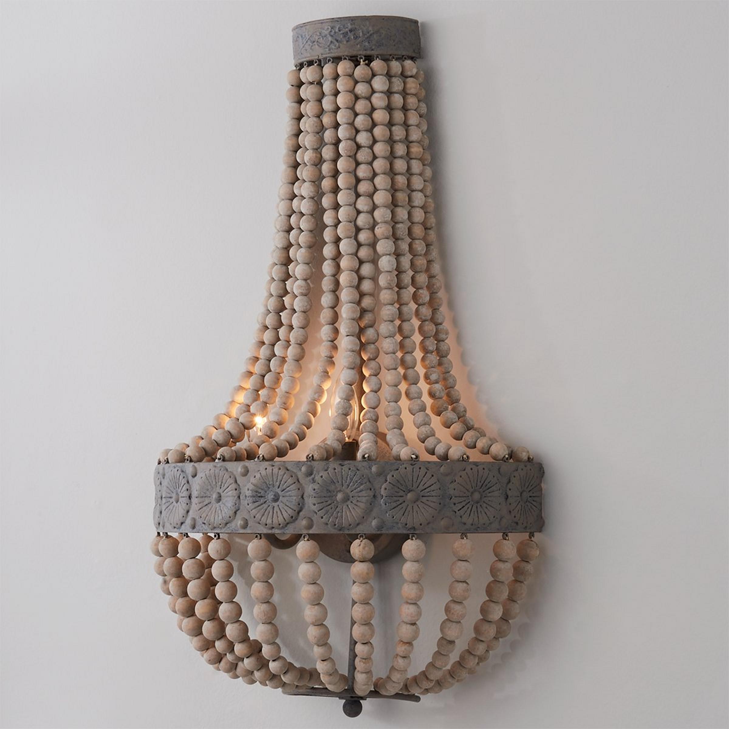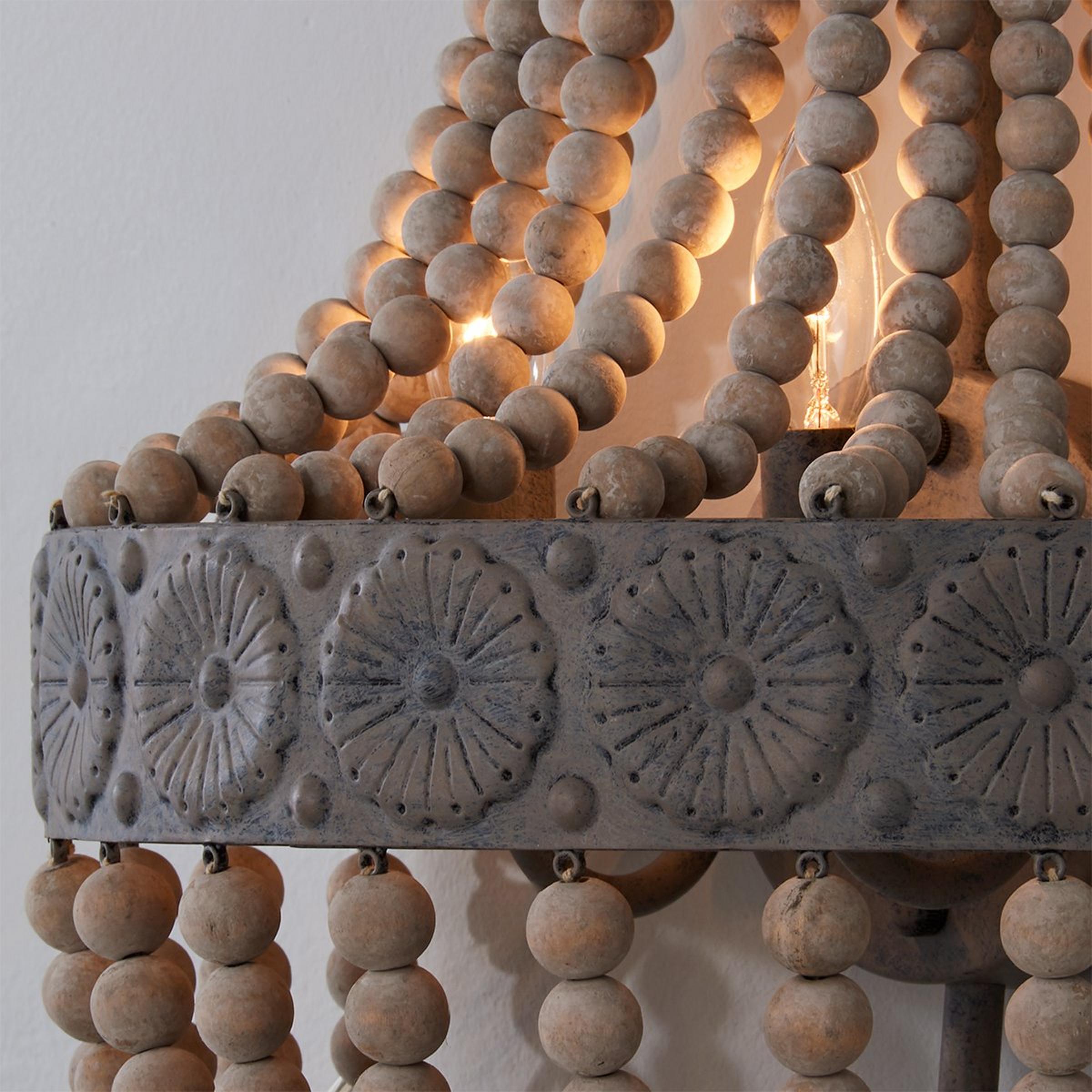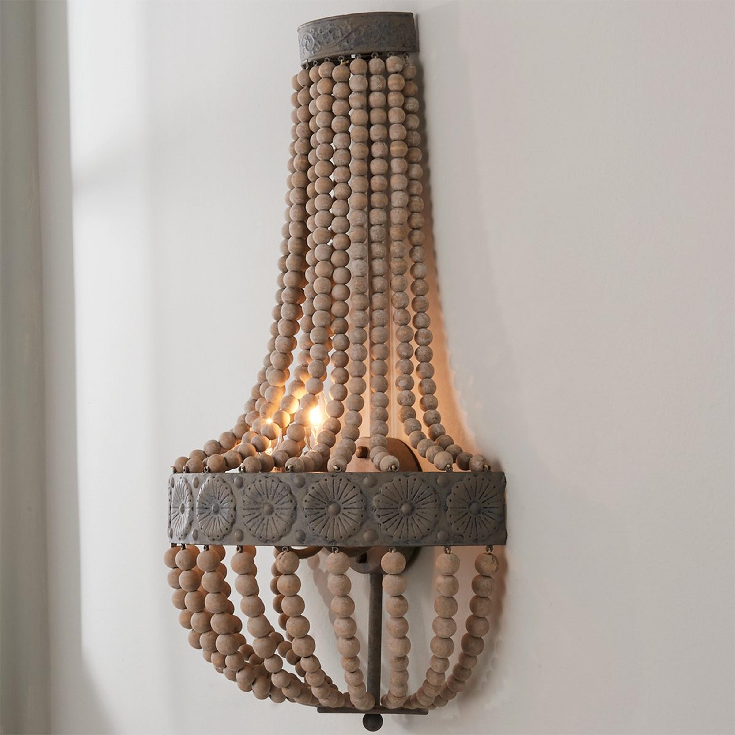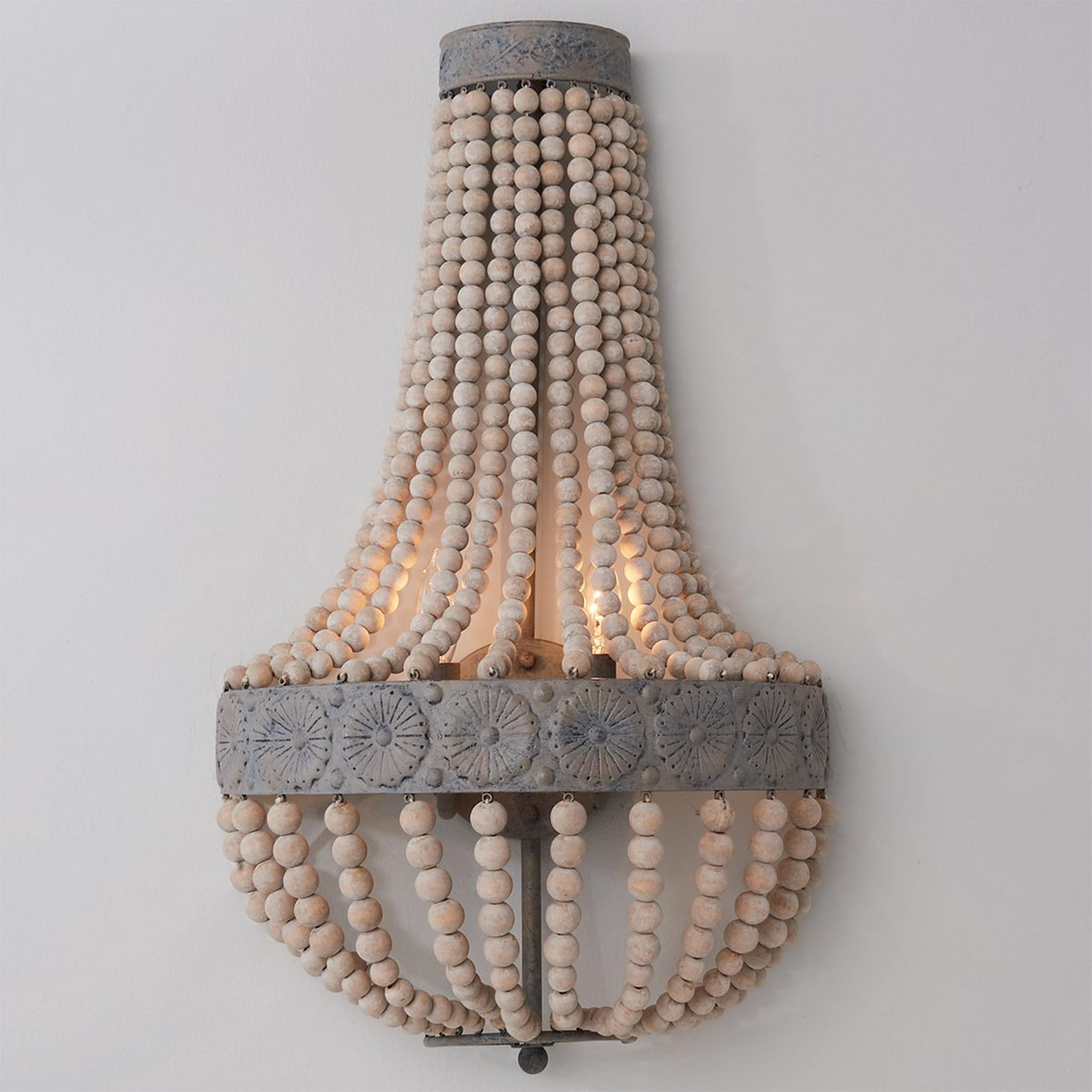 Classic style meets rustic charm with this distressed sconce featuring a dome-shaped basket of weathered gray wash wooden beads.