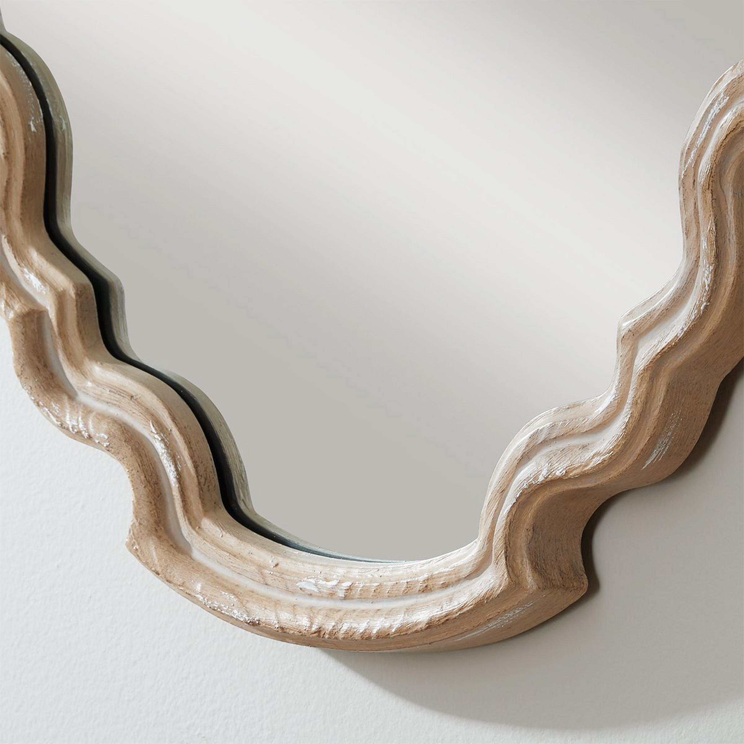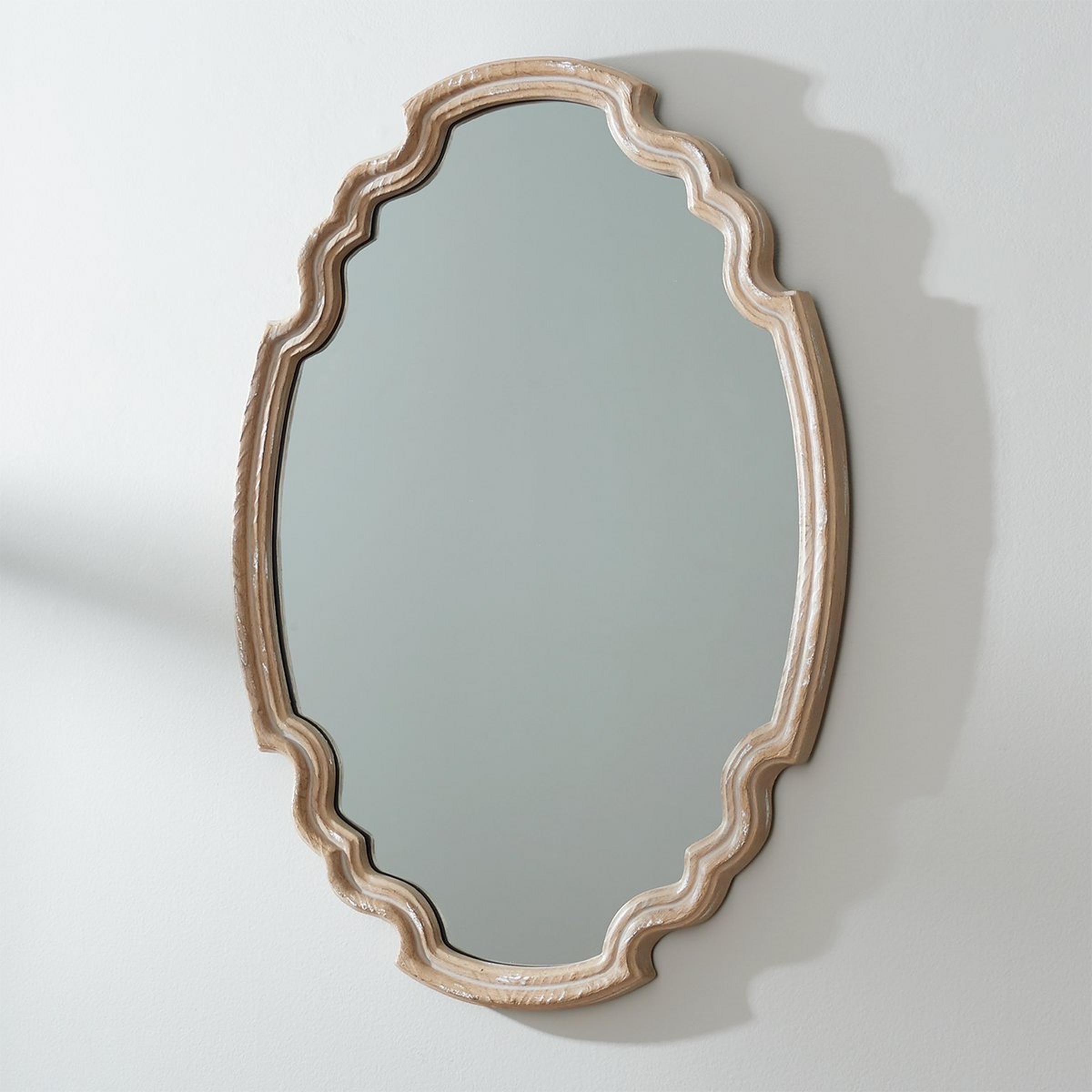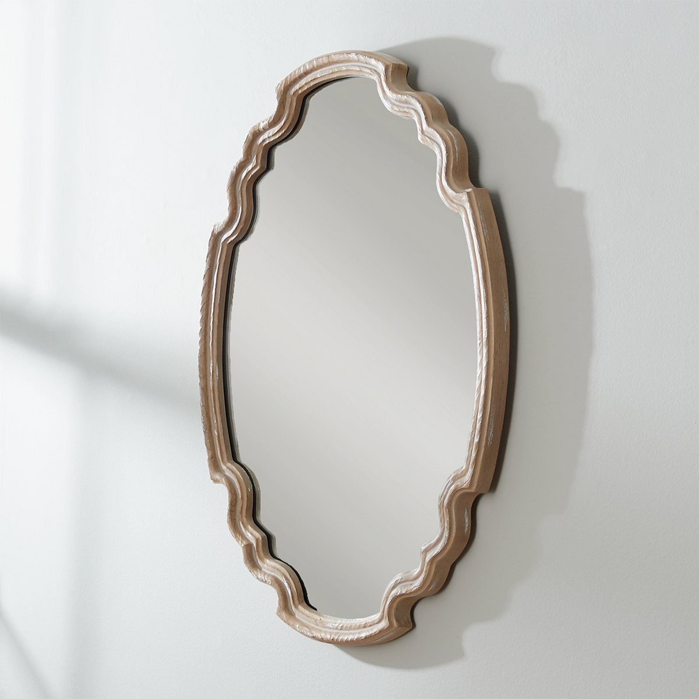 Vintage chic best describes this natural aged wood shield mirror accented with distressed ivory highlights. This mirror is the perfect size to hang over a vanity, dresser or entry table.