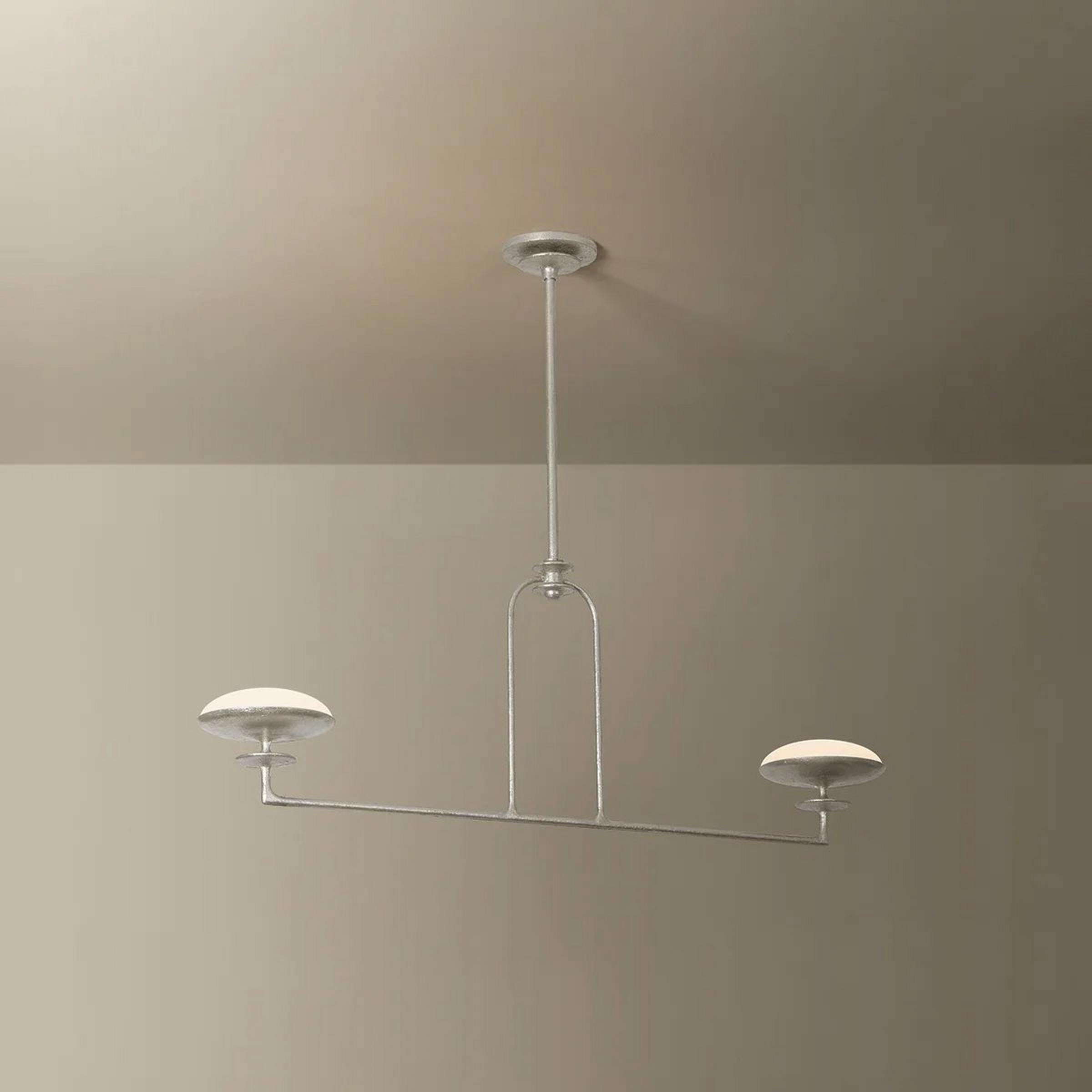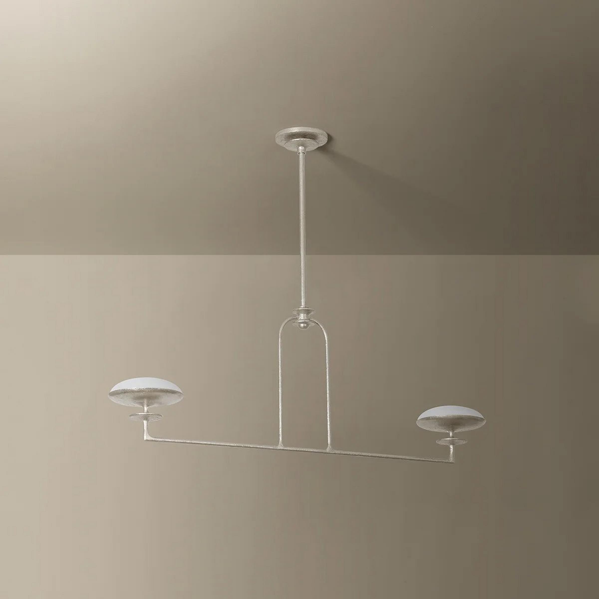 The Albedo Linear Chandelier prominently features hand-applied silver leaf on the metalwork, generously wide glass shades, and fine decorative accents throughout the design. The curved shades are upturned to bounce light off walls and ceilings, softening the effect and filling an entire room with illumination. Installed above a kitchen island or dining room table, this chandelier adds functional light for tasks such as food prep and events such as evening parties. The silhouette emphasizes the delicate framework, maintaining an airy aesthetic.