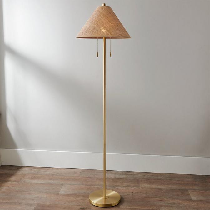 Cozy and casual, this lamp makes a warm addition to an inviting home. A wide tapered shade, lit with two bulbs, features a natural texture and spreads light broadly and gently. Its slim profile allows for versatile placement to accommodate any space.