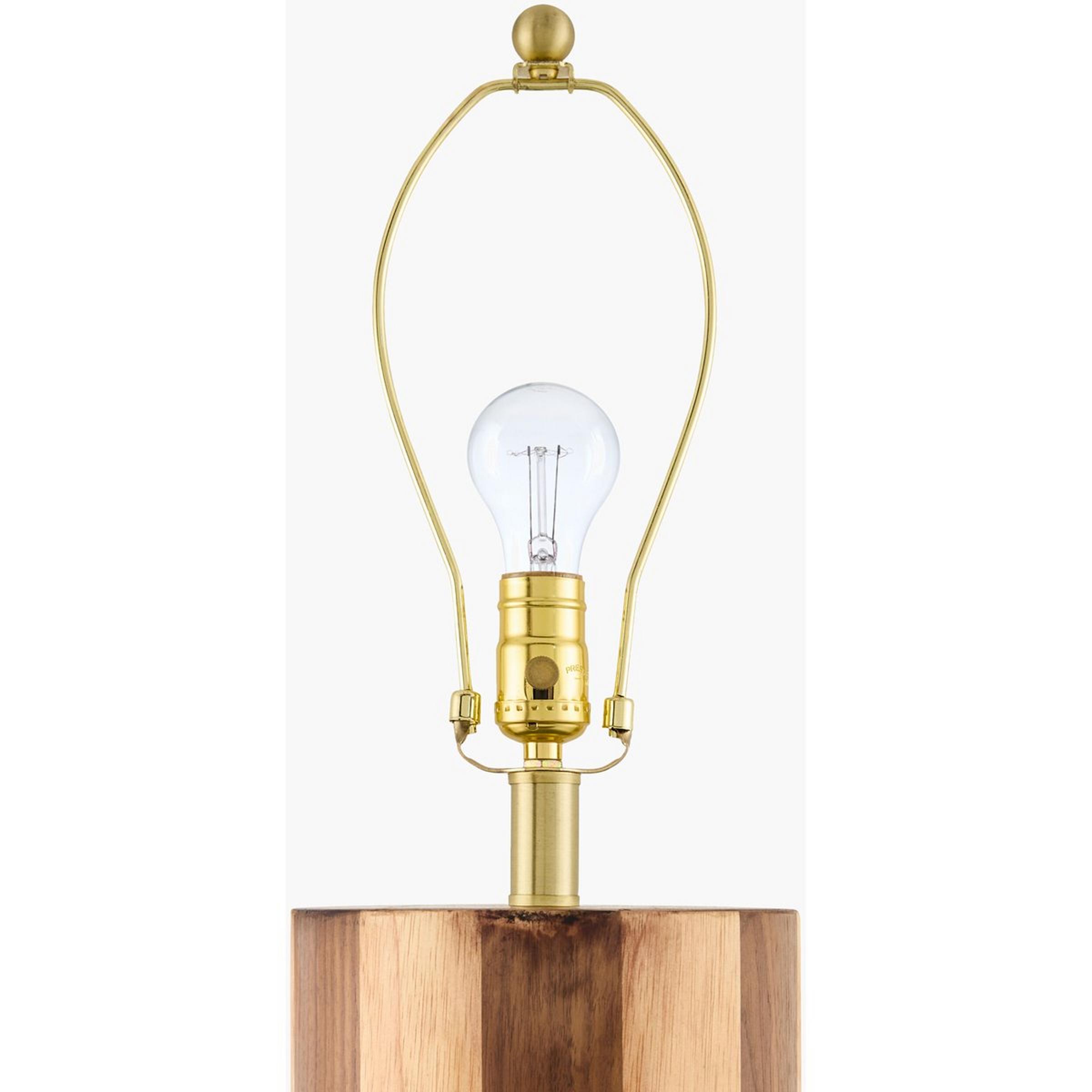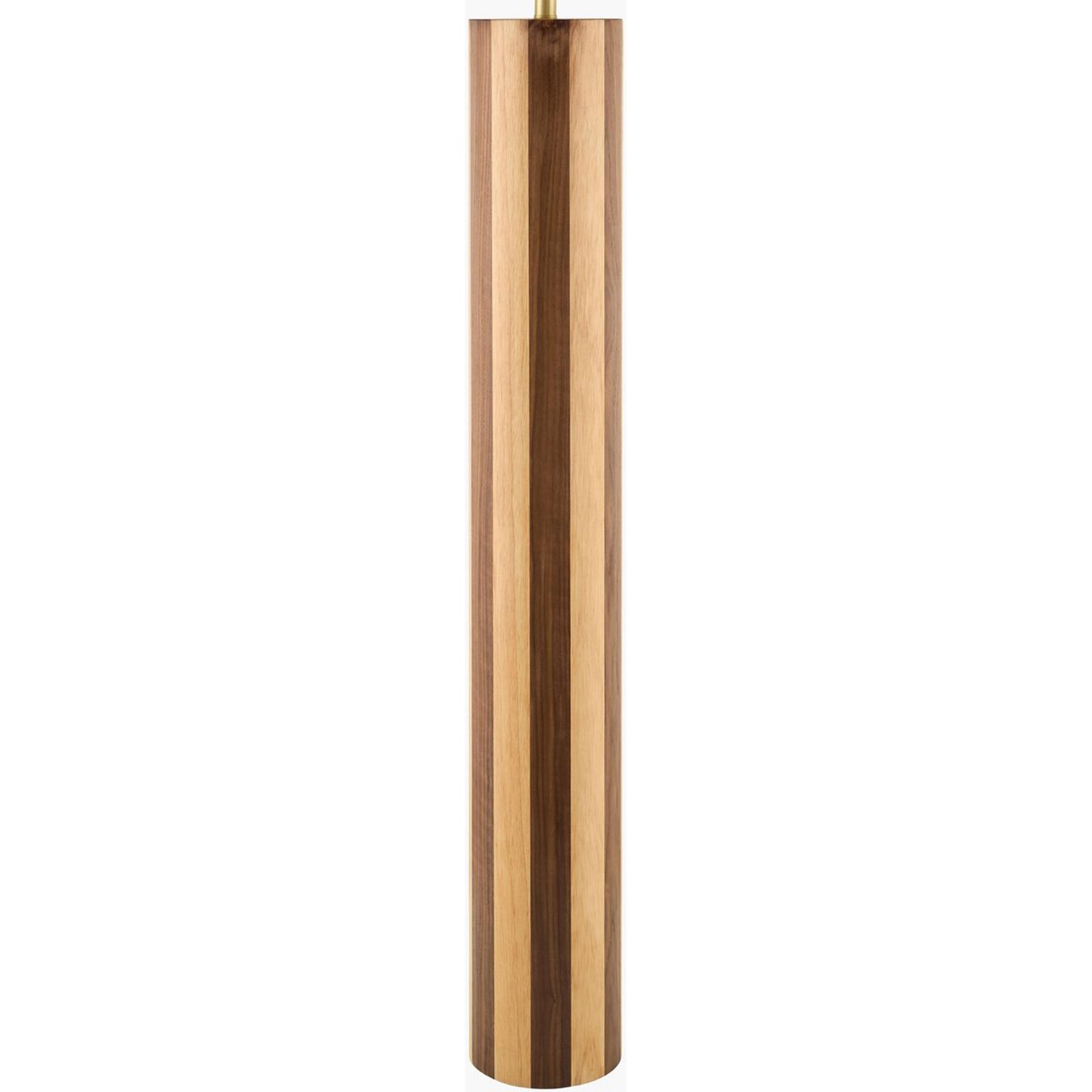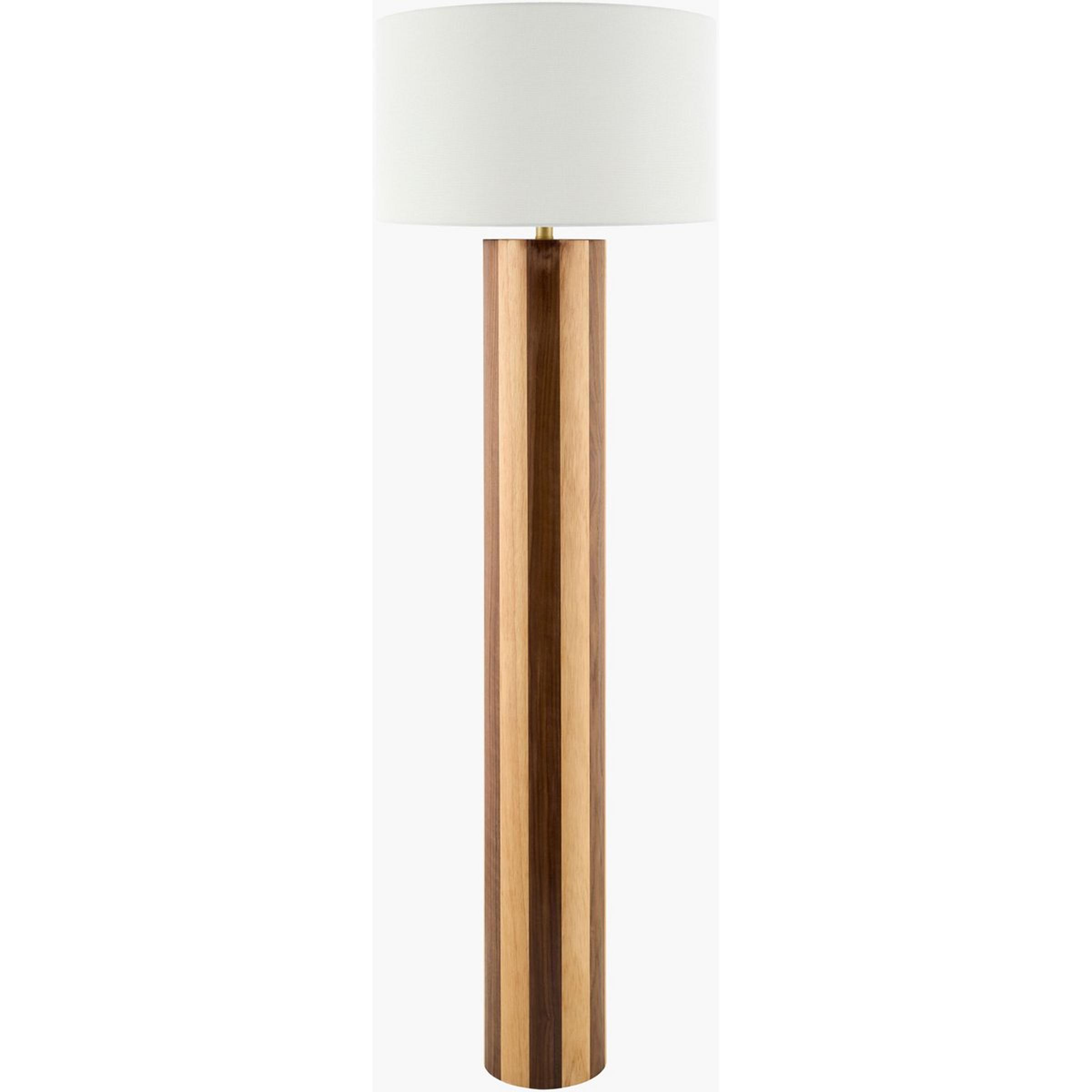 Utilizing the natural variance of wood tones, this floor lamp reimagines its natural material for an inspired look. The sleek, elongated silhouette forms a stunning look underneath its simple drum shade. With its compact form, this lamp combines a modest artisanal look with practical illumination. Perfect for a reading nook or an office, this lamp's delightful use of color accentuates the decor of any space. The thoughtful interplay of organic hues adds depth and evokes a stripped pattern, highlighting its detailed craftsmanship.