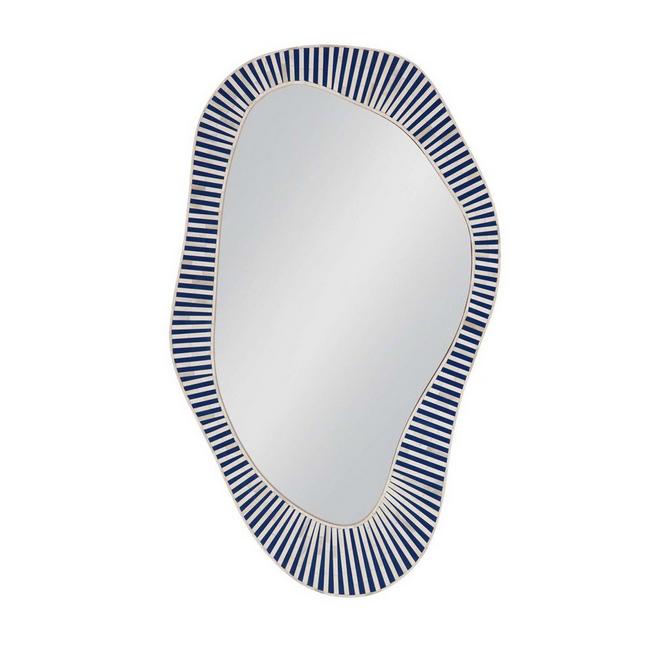 This mirror adds a whimsical, artistic feel to any front entryway, accent wall, or home office. Not only does the frame ebb and flow organically around the perimeter of the mirror, it also features an array of dynamic stripes bursting outward. The frame is formed by alternating colors of bone tile, introducing a mosaic of visual interest. Install as a bold accent to add spice to a room that contains more calm, neutral furniture and décor. With full-length height and width, this mirror demonstrates that it is as functional as it is beautiful.