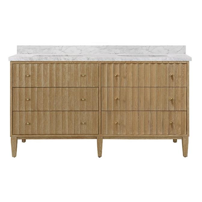 The Alstrom Vanity highlights everything valuable about detail-oriented design and natural wood materials. Beneath a 1 1/4" Carrara marble countertop, the front faces of the drawers feature a decorative ribbing that visually bridges them together into a cohesive cabinet. The tapered legs borrow visual language of mid-century modern furniture, appearing lightweight and simple. The wood has been finished with a cerusing technique to add highlights to the grain of the wood for further sophistication. Due to the qualities of natural wood grain, each piece is unique and no two will be alike.