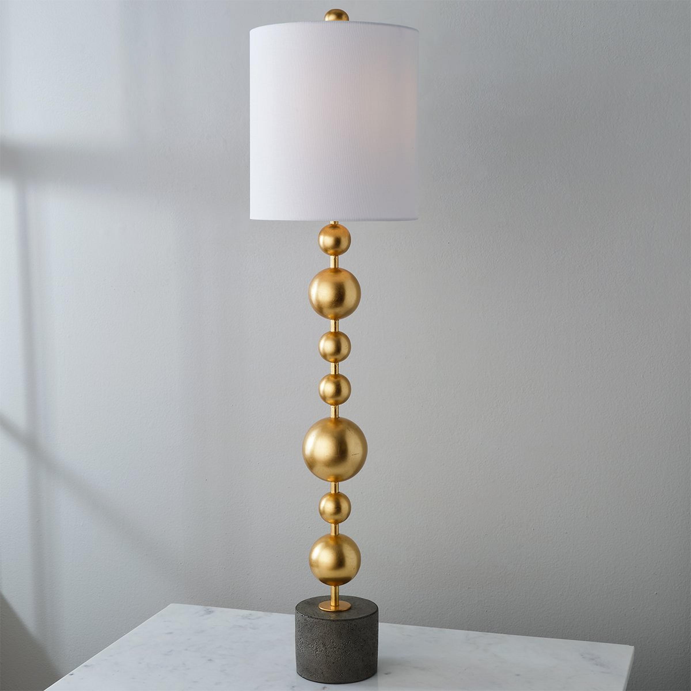 The Amasya Buffet Lamp showcases contemporary design with stacked metal orbs finished in gold leaf for an eye-catching effect. It features a charcoal-stained concrete base and a white linen shade, adding a touch of modern sophistication to any space.