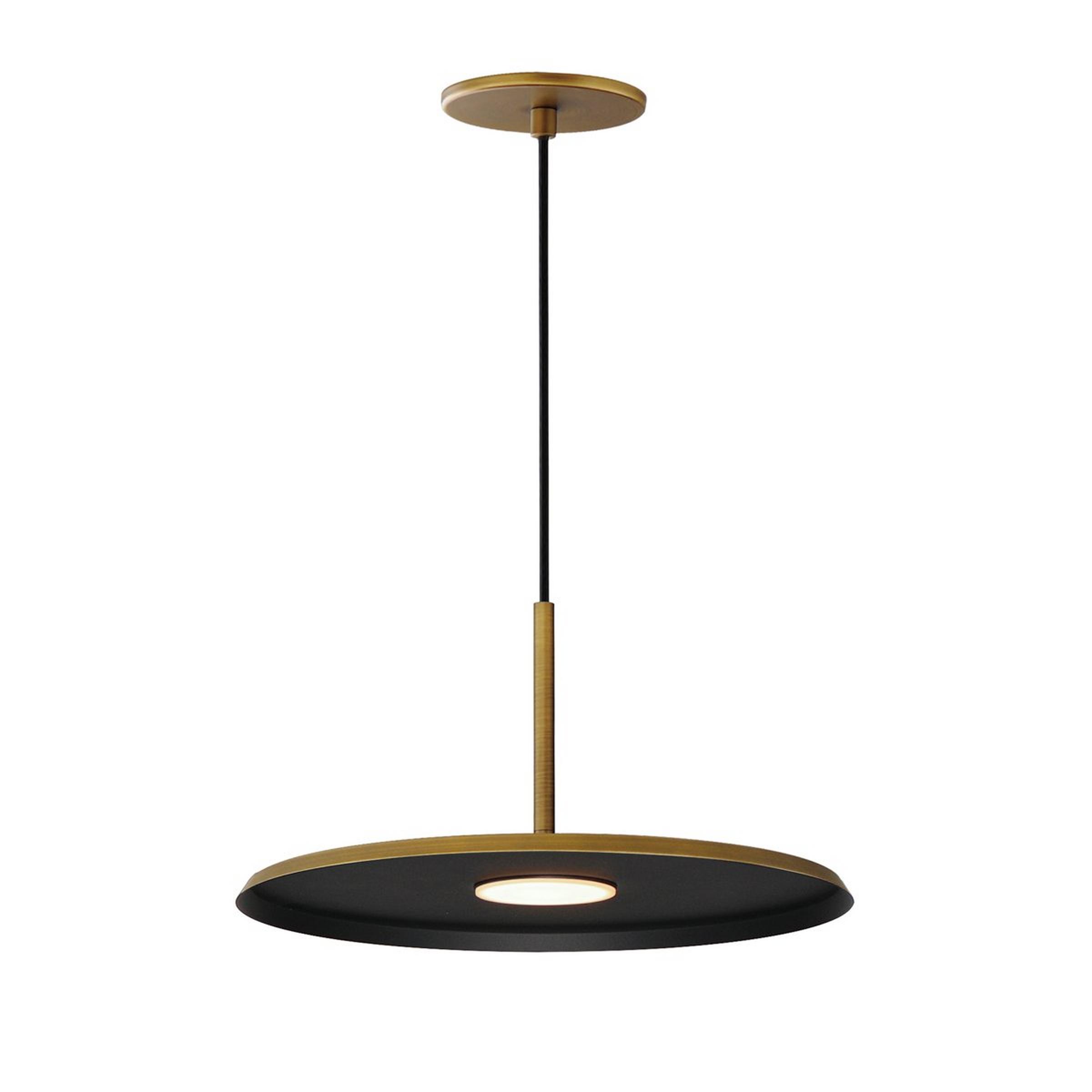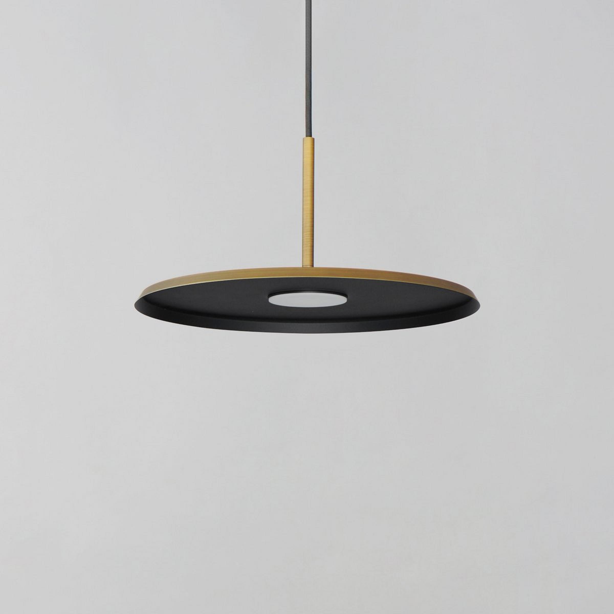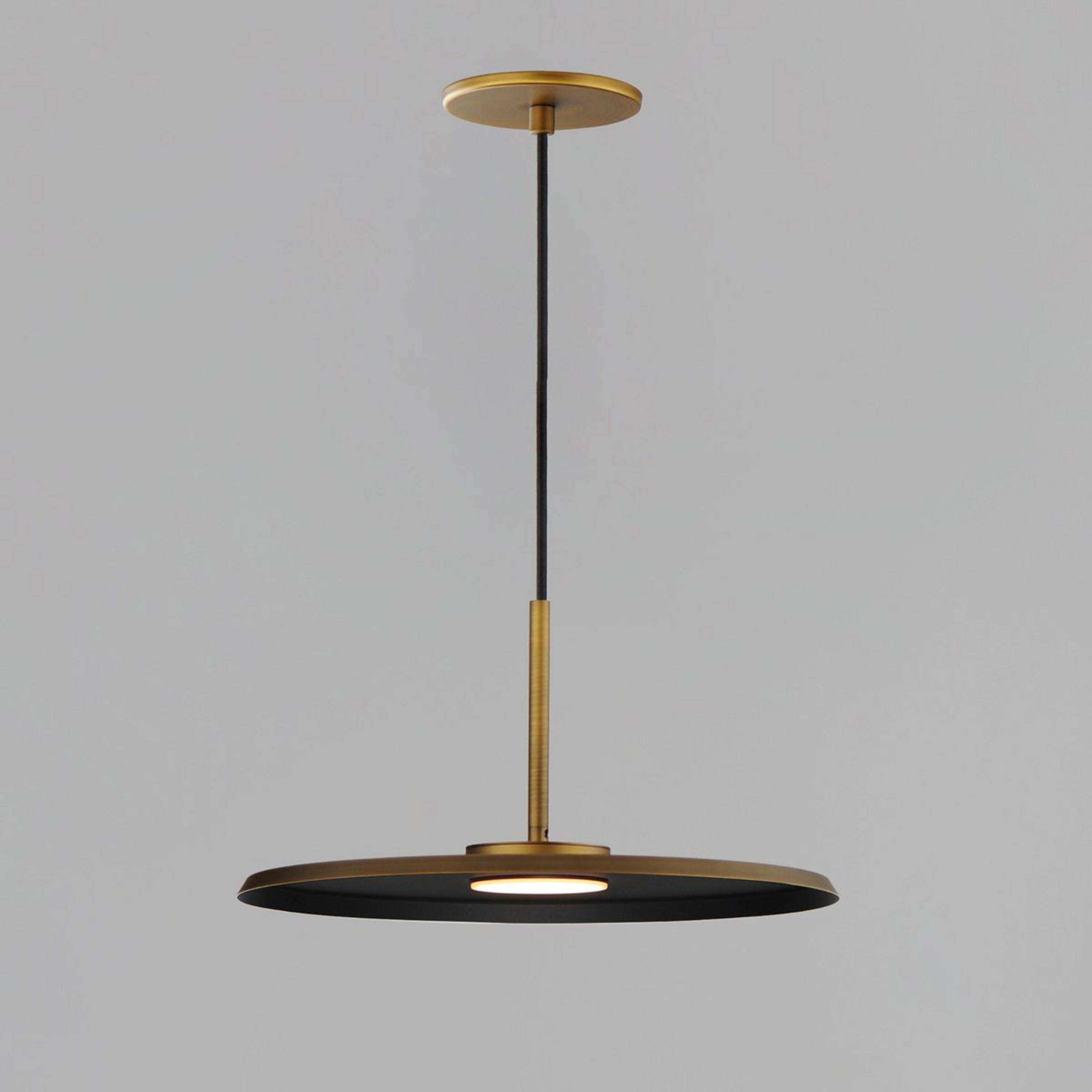 Slim and sleek, this pendant hangs with subtlety. Due to its minimal shape, it appears weightless as it floats. Fine rippled details are etched on the surface of the aluminum drawing inspiration from the texture of vinyl records. The moody aesthetic is completed by an integrated LED that glows downward, setting an intimate atmosphere over any dining area, island, or front entry.