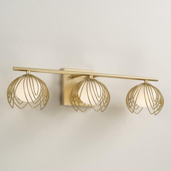 While its abstract structure keeps its floral motifs subtle, the sharp petal shapes that surround this vanity light's opal glass evoke its botanical inspiration for a stunning look. The layered thin rods that bend to create the flower shape allow light to pass through the airy design, highlighting its bold metallic frame and providing ample illumination in your space. Its elongated silhouette is the perfect way to brighten larger bathrooms or enhance wider mirrors in a powder room. This vanity light is a delightful centerpiece, enriching your space with a whimsical charm.
