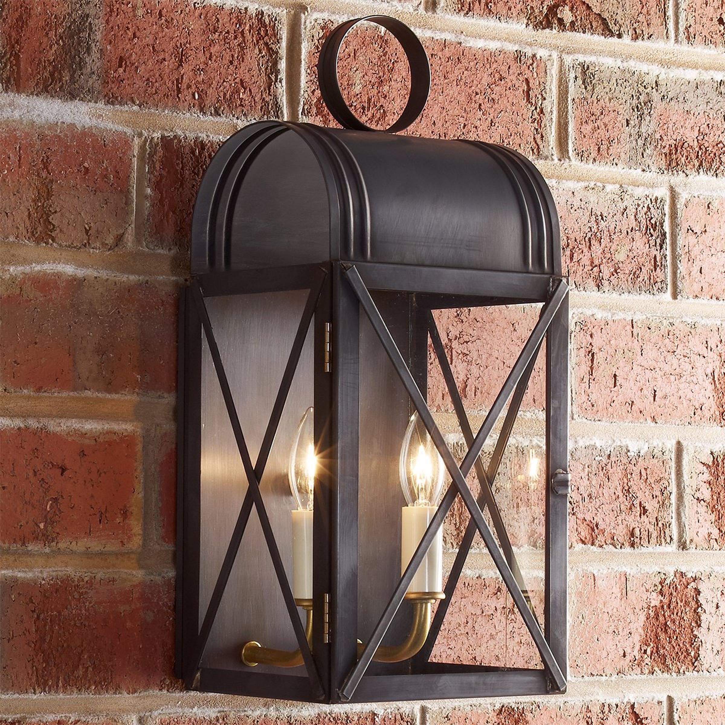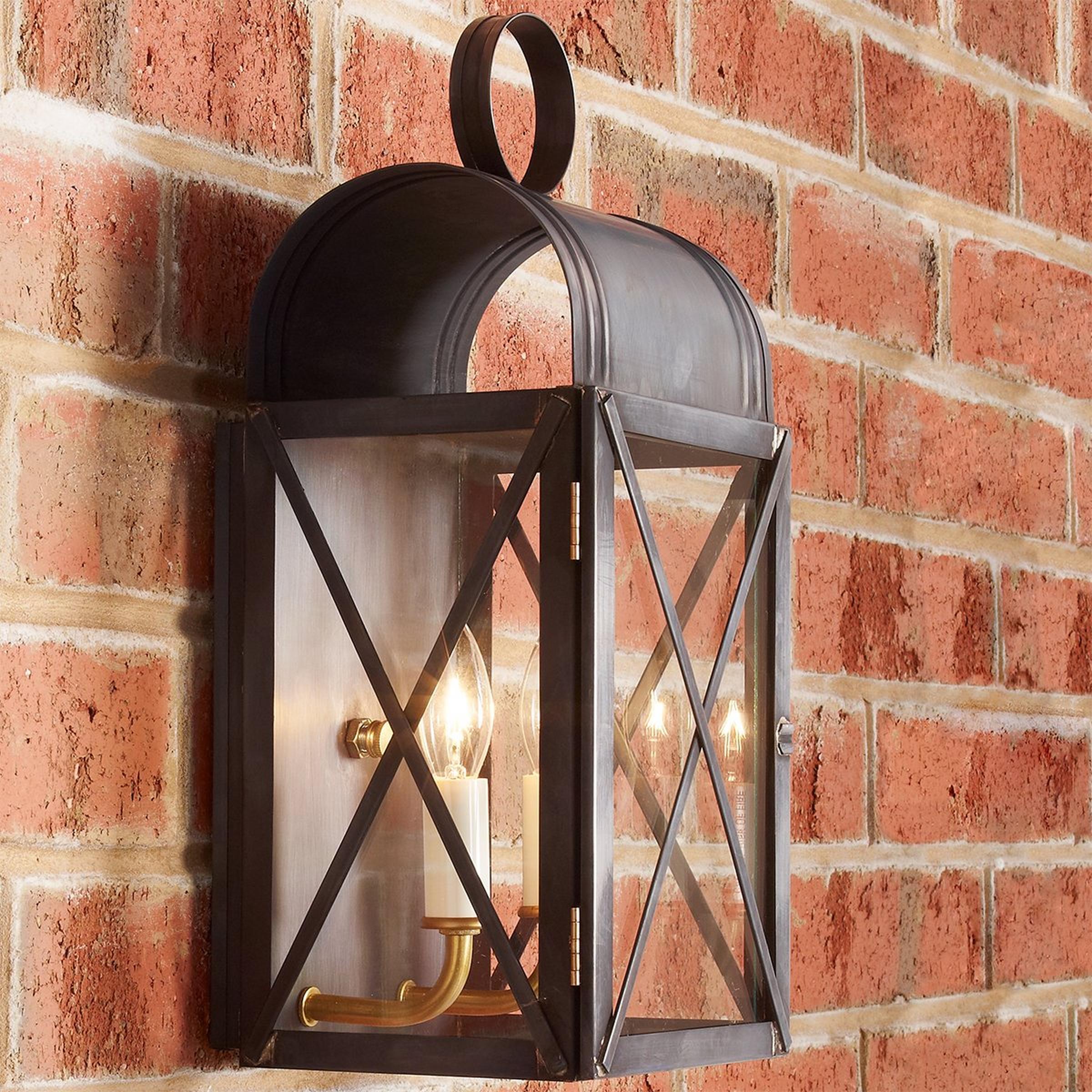 With arched roof, circle finial, 2 lights and clear glass, this classic pocket lantern design has graced homes from colonial times to today. Darkened copper gives a vintage, aged look without the wait! Copper and brass are living metals that will change and patina over time, the color and speed of which varies based on environmental factors. Handcrafted in Richmond, Virginia by our local artisans. Made to order. Backplate: 8.75"x6" Working door with latch for re-lamping. Mounting hole (distance from bottom to center of backplate) is 4.75". Please note: Fixtures accumulating salt in coastal environments must be rinsed regularly to prevent corrosion. Items listed with Clear Coat are finished with a protective clear coating that may help to slow the natural patina of the copper or brass. This can be helpful in preserving the current look of the product, or as a protection against harsh environments.