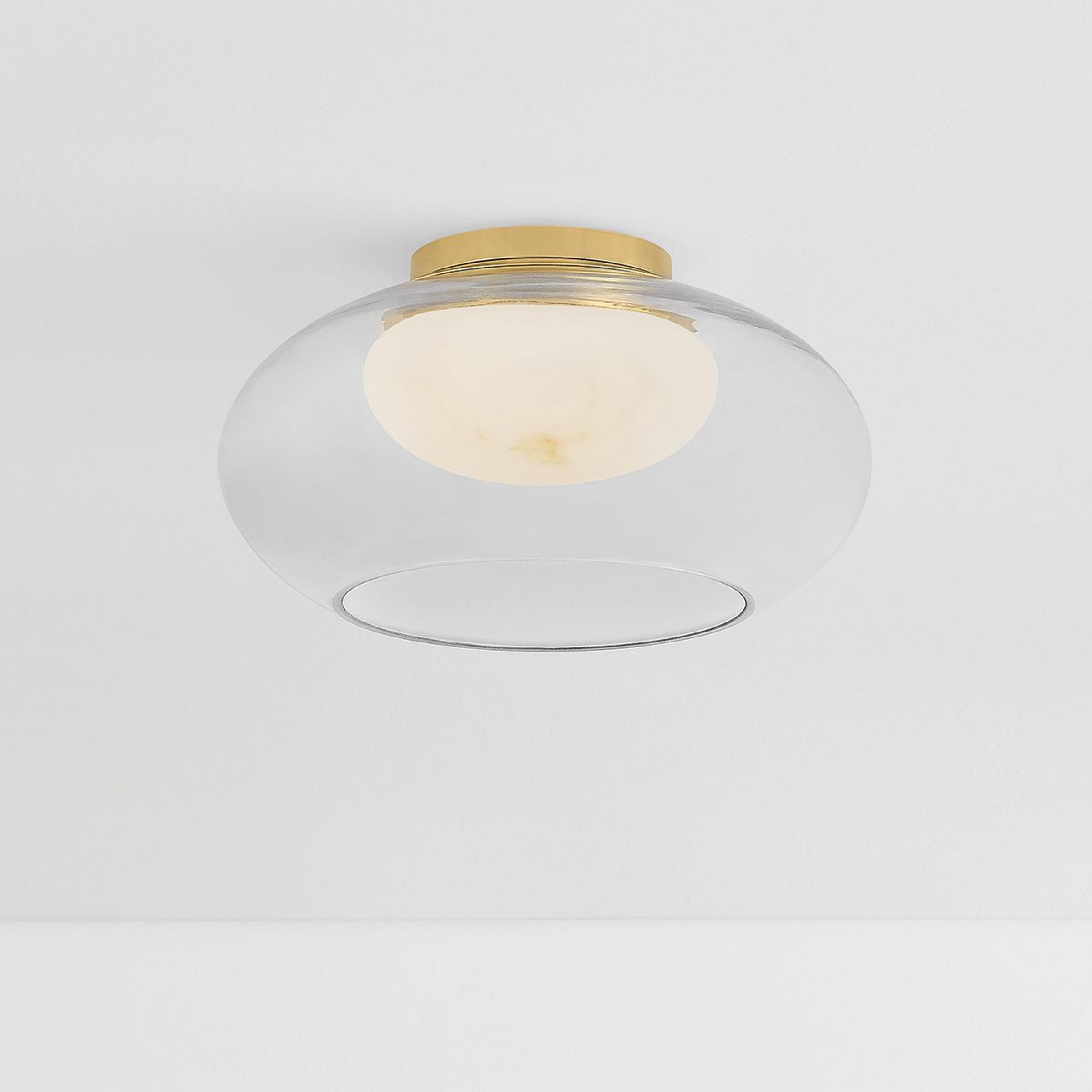 Where ordinary glass fixtures would shade a bare bulb, this fixture introduces a luxurious alabaster diffuser to both soften light and add a stony texture. Both the glass and alabaster share an elevated, oval shape and are layered together to create an exciting accent in any room.