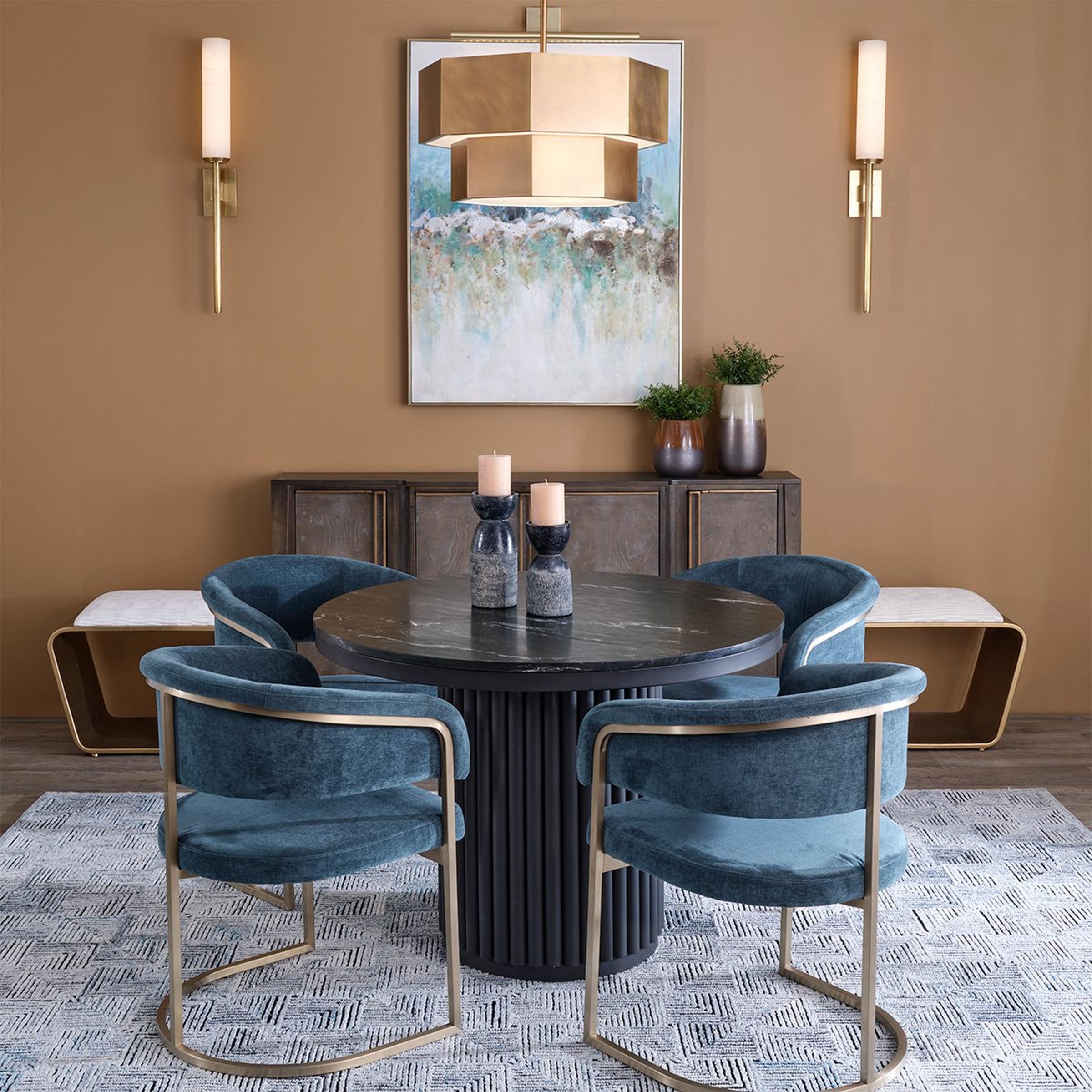 The Aro Bench is an exquisite piece, showcasing a luxurious off-white pleated fabric elegantly complemented by a looped metal base finished in antique gold.
