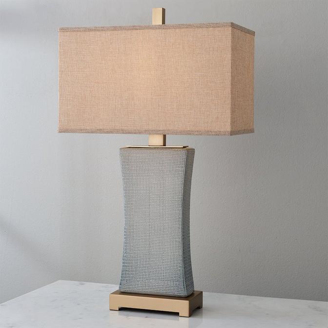 The Asti Table Lamp showcases beautifully textured ceramic in a serene pale blue-gray glaze, accented with elegant antique brass details. Its rectangular hardback shade is crafted from khaki linen fabric. Please note that this fixture is finished with a reactive glaze, so expect and celebrate differences in color and texture. No two fixtures will be exactly alike, adding to the unique nature of this table lamp.