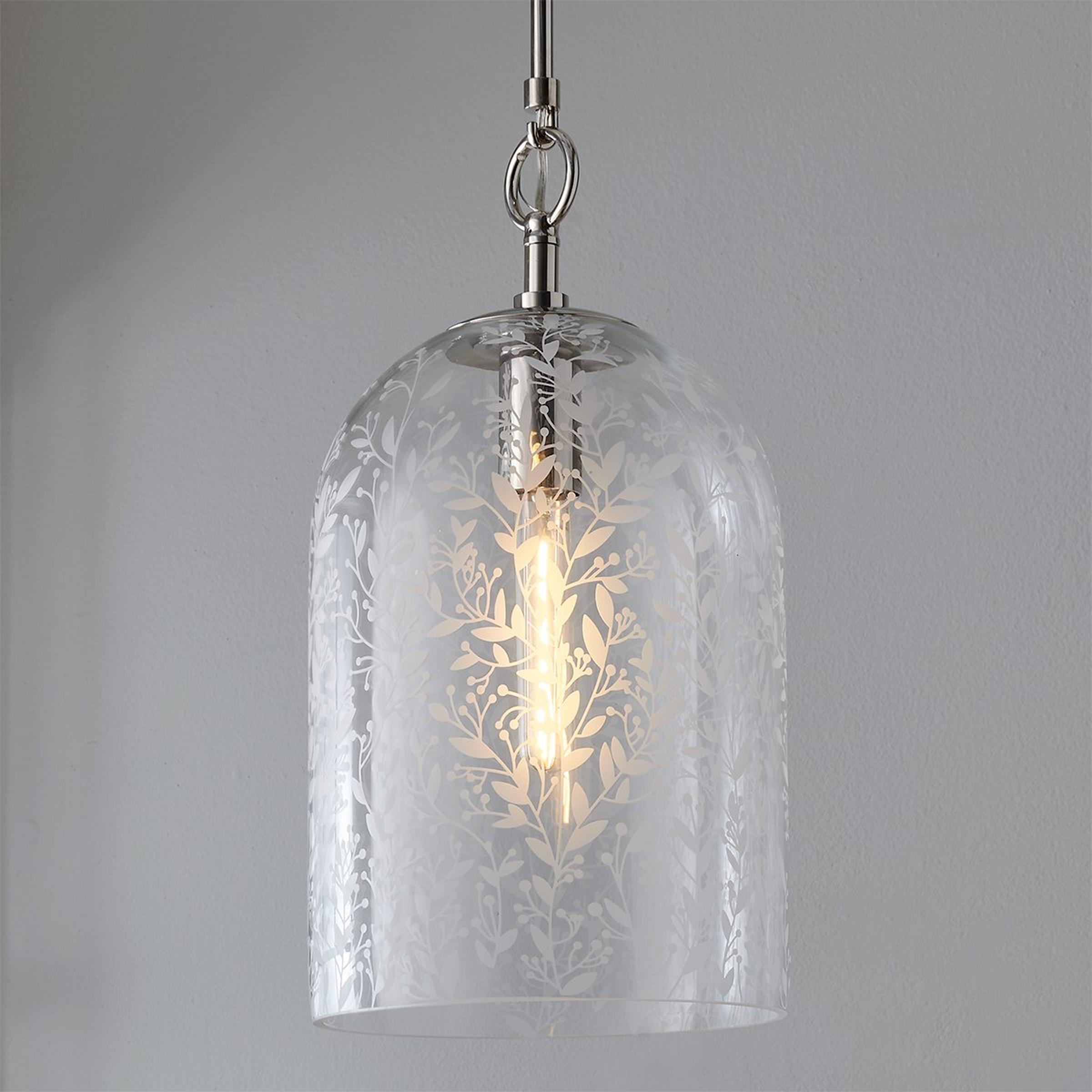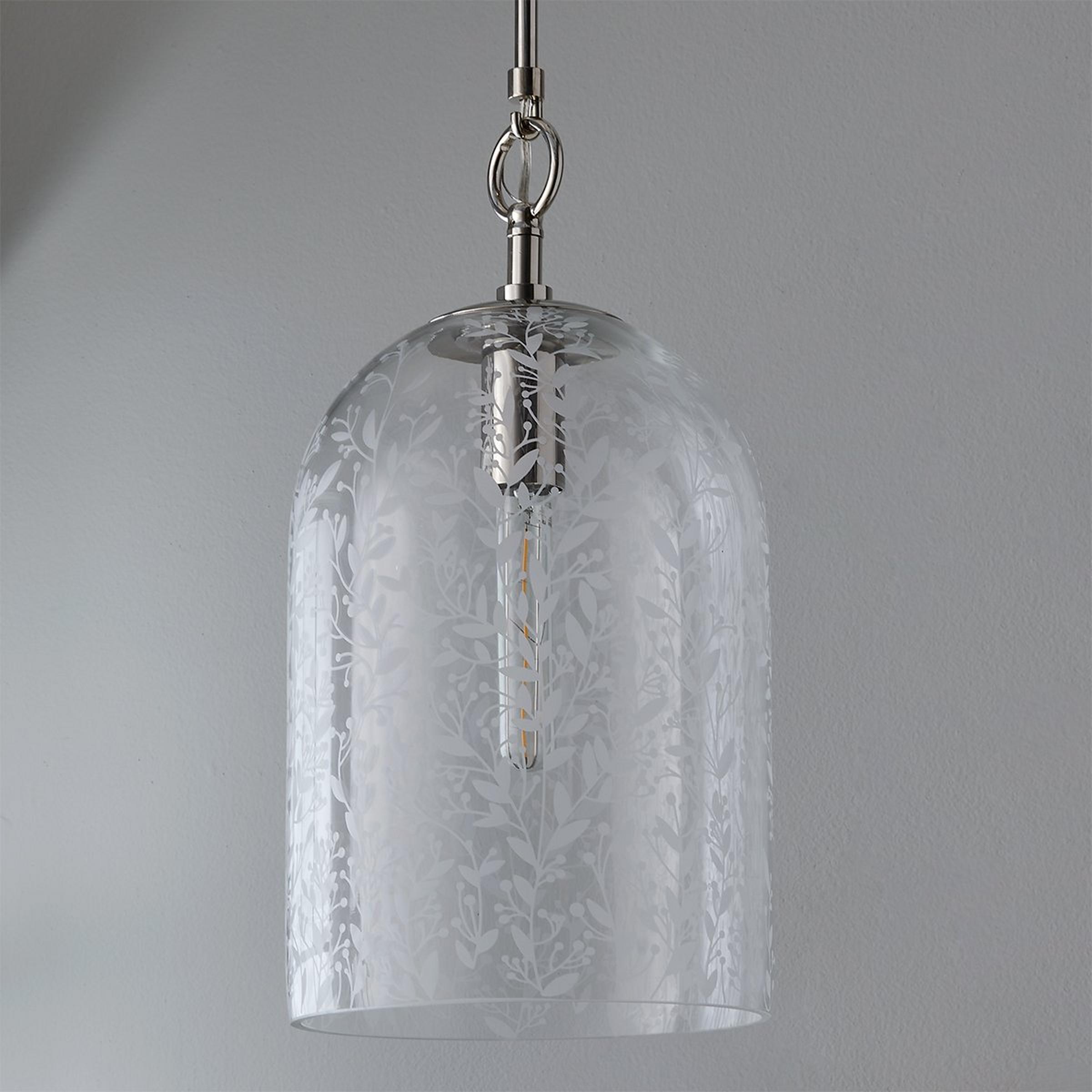 The Astoria Fleur Pendant features delicate floral etching on a clear glass shade, creating a truly mesmerizing design. When lit, it casts an enchanting display of reflections and shadows, filling the room with a magical ambiance. Notably inspired by nature, it is a stunning decorative element that injects a touch of whimsy into any setting.