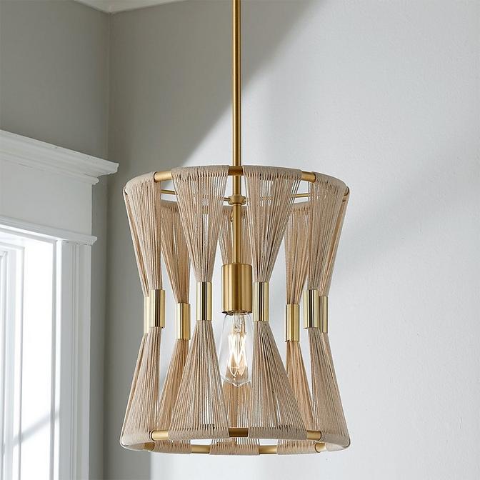Subtle drama is emitted from our Axel Collection in a modern form. Each cinched detail is adorned by patinaed brass for a mixed contrast of metallic finishes versus natural rope. These mid-century designs will curate today's trends for your updated and stylish home. This fixture has handcrafted details, meaning subtle variation from piece to piece makes each light unique. The natural ivory rope is hand-bleached, the rope is hand-wrapped, and the brass patina is hand-applied.