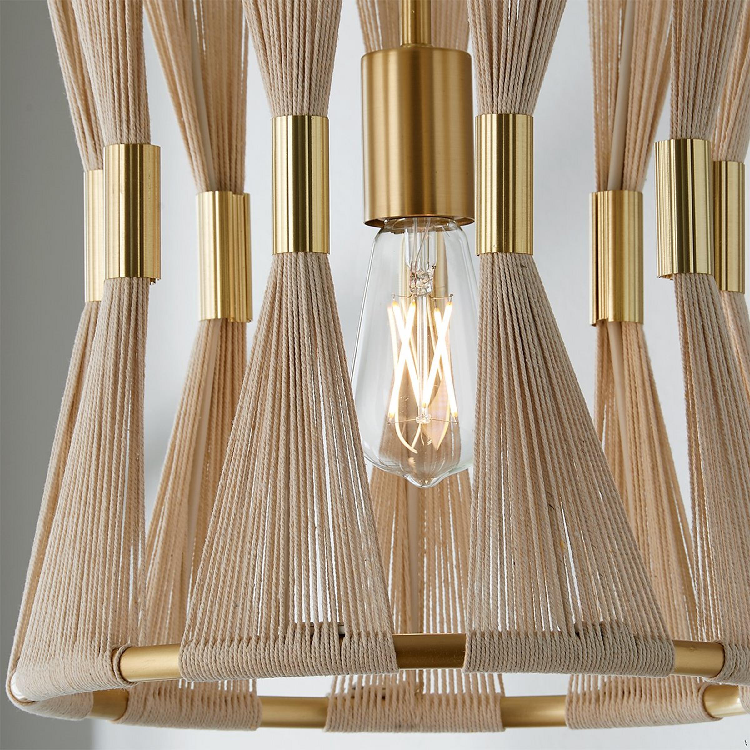 Subtle drama is emitted from our Axel Collection in a modern form. Each cinched detail is adorned by patinaed brass for a mixed contrast of metallic finishes versus natural rope. These mid-century designs will curate today's trends for your updated and stylish home. This fixture has handcrafted details, meaning subtle variation from piece to piece makes each light unique. The natural ivory rope is hand-bleached, the rope is hand-wrapped, and the brass patina is hand-applied.