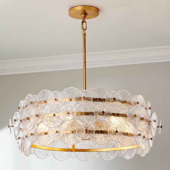 The layers of pressed glass create a radial pattern that gives Aylin its remarkable appearance. The transparent texture enhances light and illuminates the metallic frame. The distinctive shapes created by the circular glass panels add a glamorous glow to your home!