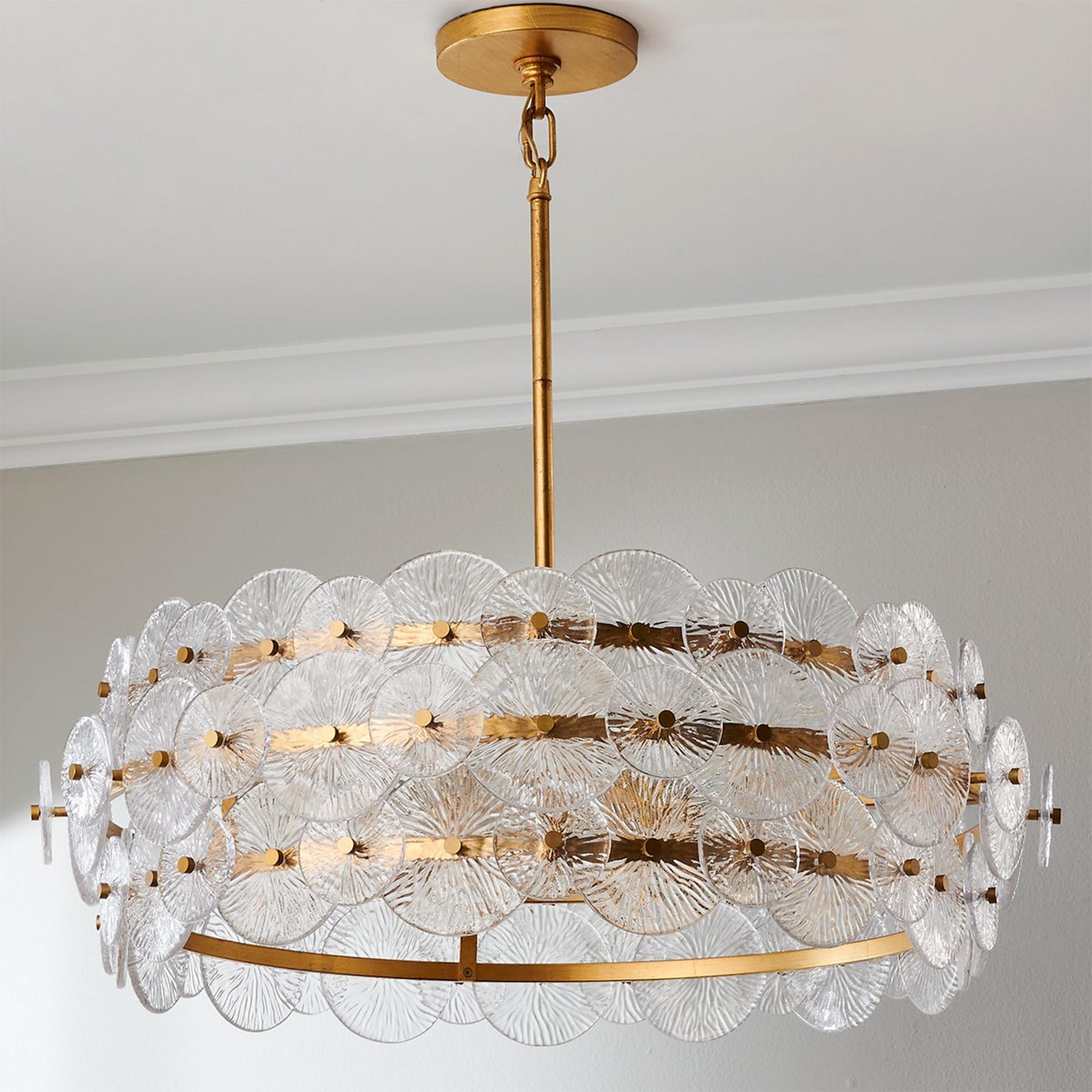The layers of pressed glass create a radial pattern that gives Aylin its remarkable appearance. The transparent texture enhances light and illuminates the metallic frame. The distinctive shapes created by the circular glass panels add a glamorous glow to your home!