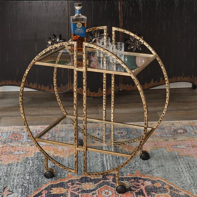 The Azine Bar Cart is a versatile addition to any home with a heavily antique gold finish, hand-forged iron, hammered texturing, two clear tempered glass shelves, and rolling casters. It's perfect for those who appreciate antique finishes or want to add a touch of elegance to their home decor.