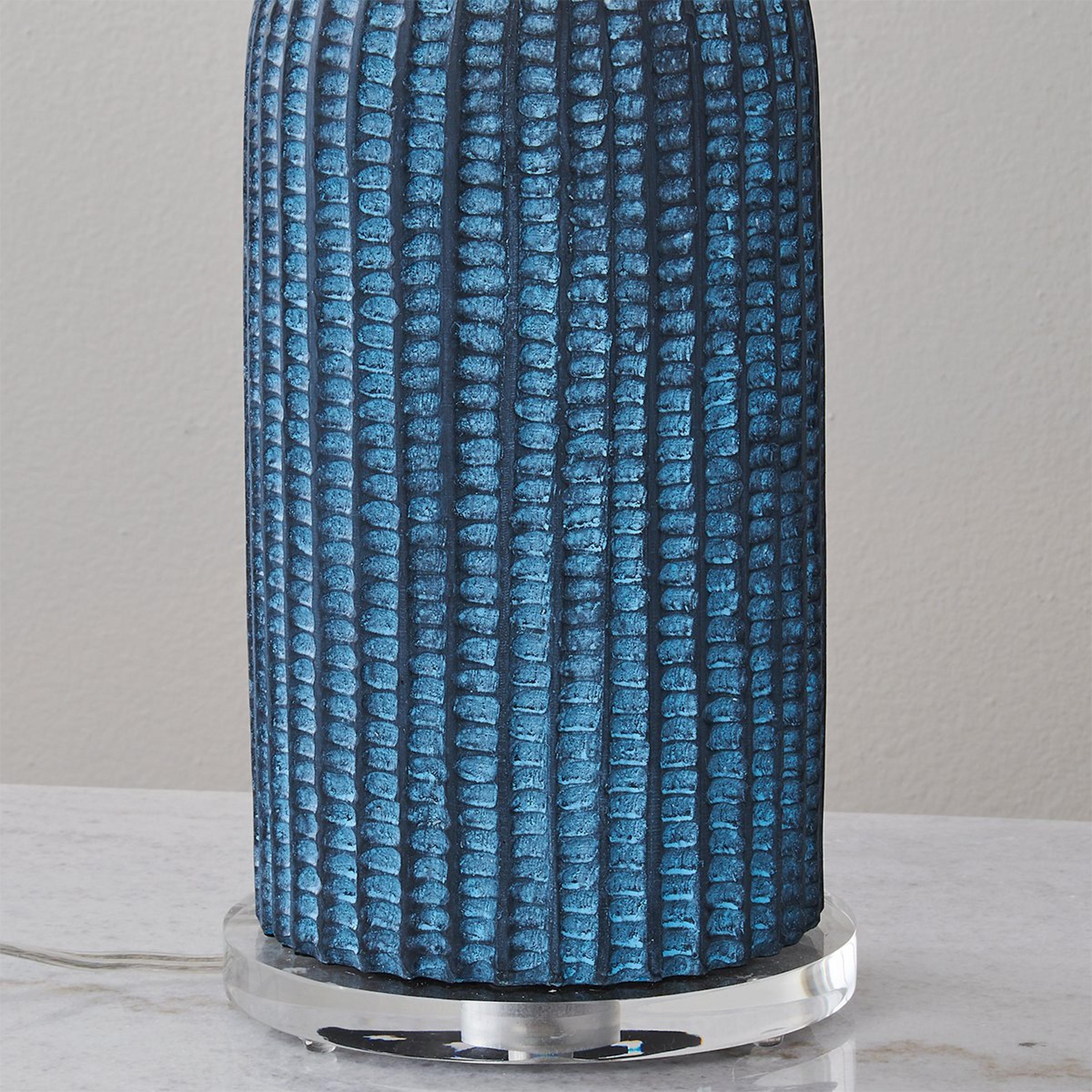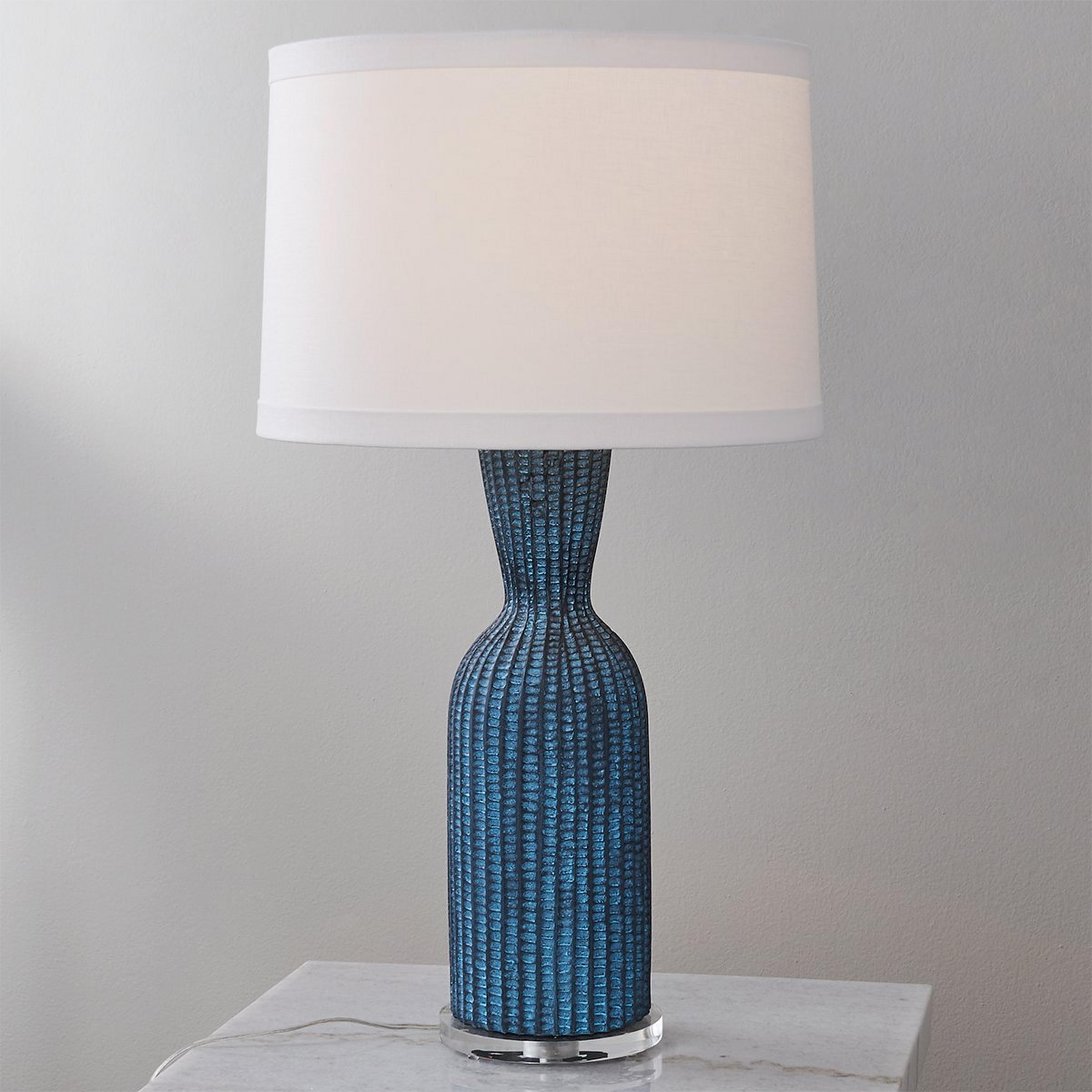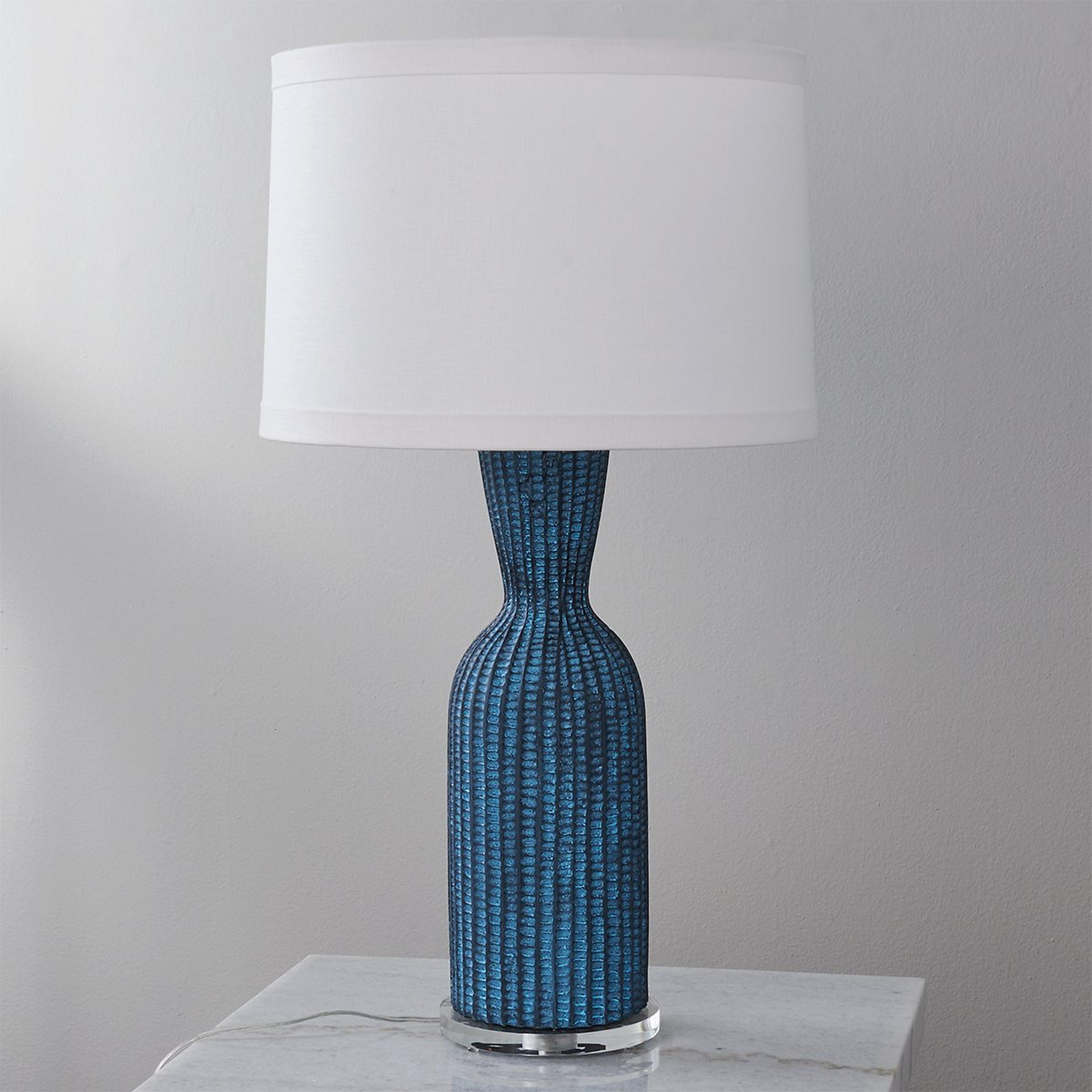 Brighten up your space with the effortlessly chic Bandon Table Lamp. Its eye-catching design features a beautiful blue resin body with vertical ridges and charming scallops, adding a playful touch to any room. Topped with a crisp white linen shade, it casts a cozy glow, perfect for creating ambiance in your space. This table lamp is assembled by hand in our Richmond, Virginia production facility.