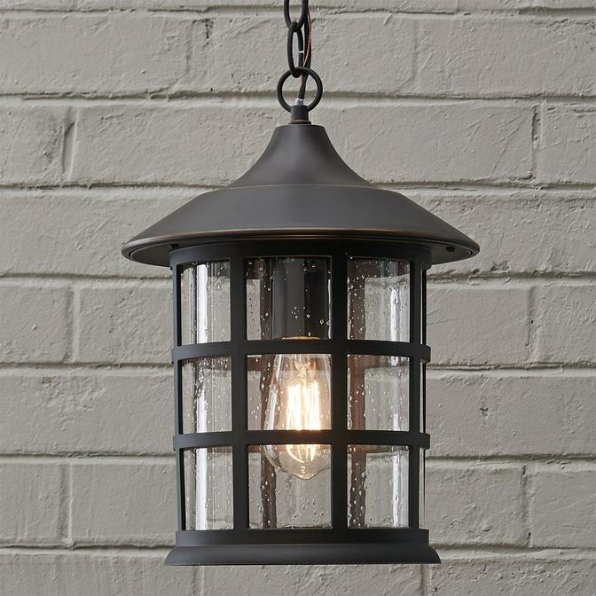 Taking its name from one of New England's favorite destinations, the Bar Harbor Hanging Outdoor Lantern will import a nautical theme with a shining beacon of light. The wrap around grid protects the seedy glass shade along with the tiered top for another decorative extra. Rust and corrosion resistant.