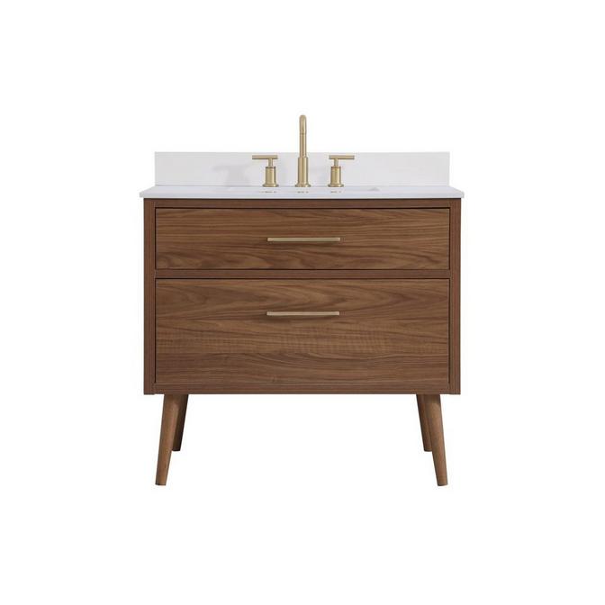 Classic wood tones enhance the mid-century appeal of our Baxter Vanity. Available in a variety of sizes and finishes, it's easy to find a match for your space! Featuring a .7" thick quartz countertop and an integrated porcelain sink, this eye-catching fixture uses natural materials to its advantage. Two soft close drawers provide storage space, so even the smallest bathroom can stay clutter-free.