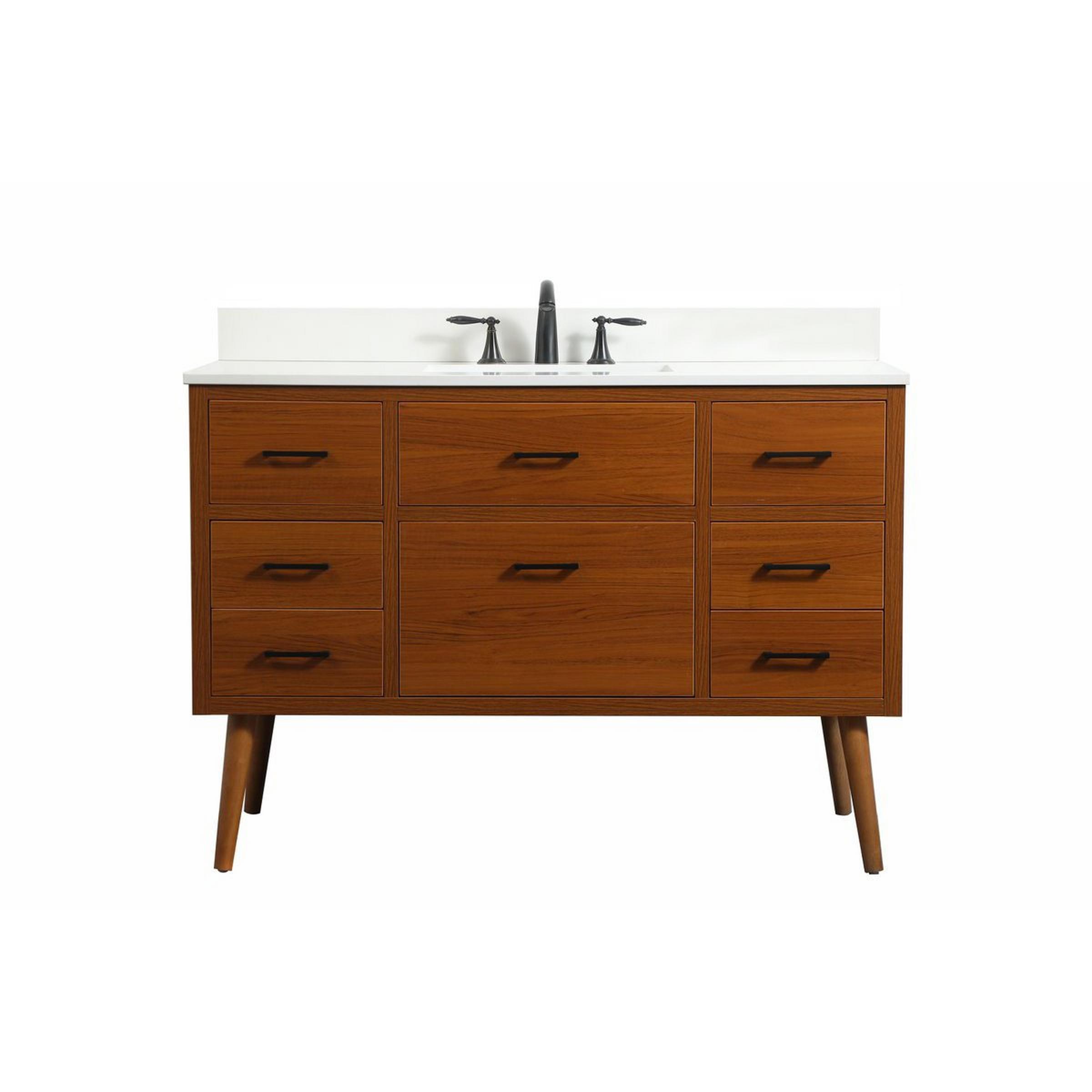 Classic wood tones enhance the mid-century appeal of our Baxter Vanity. Available in a variety of sizes and finishes, it's easy to find a match for your space! Featuring a .7" thick quartz countertop and an integrated porcelain sink, this eye-catching fixture uses natural materials to its advantage. Seven soft close drawers provide storage space so your bathroom can stay clutter-free. Please note that because this product features natural quartz, each piece is unique. Color and finish may vary.