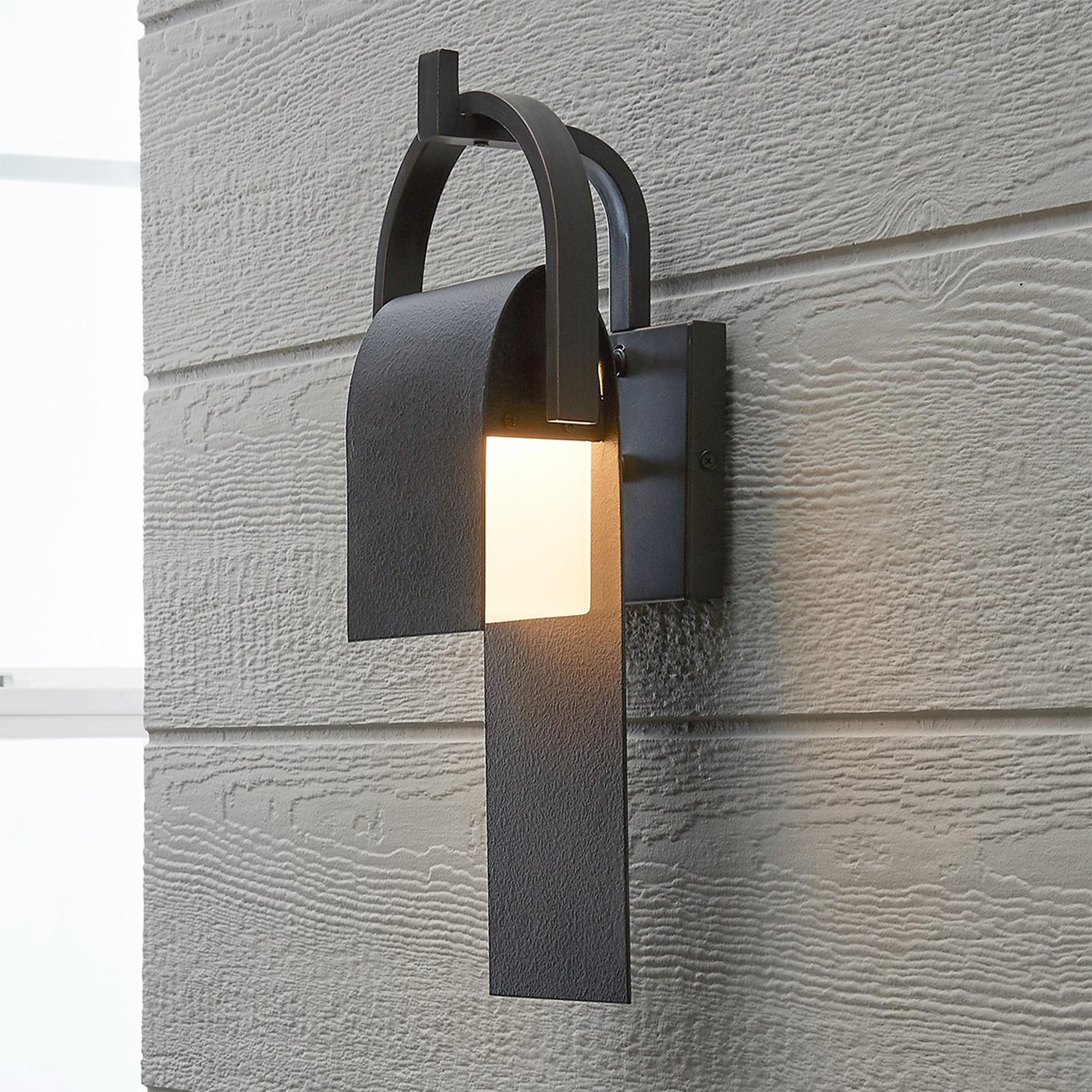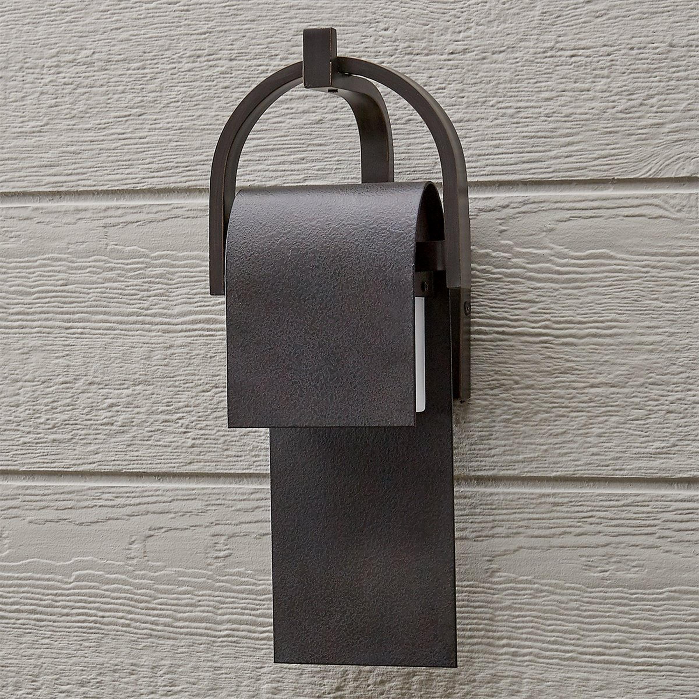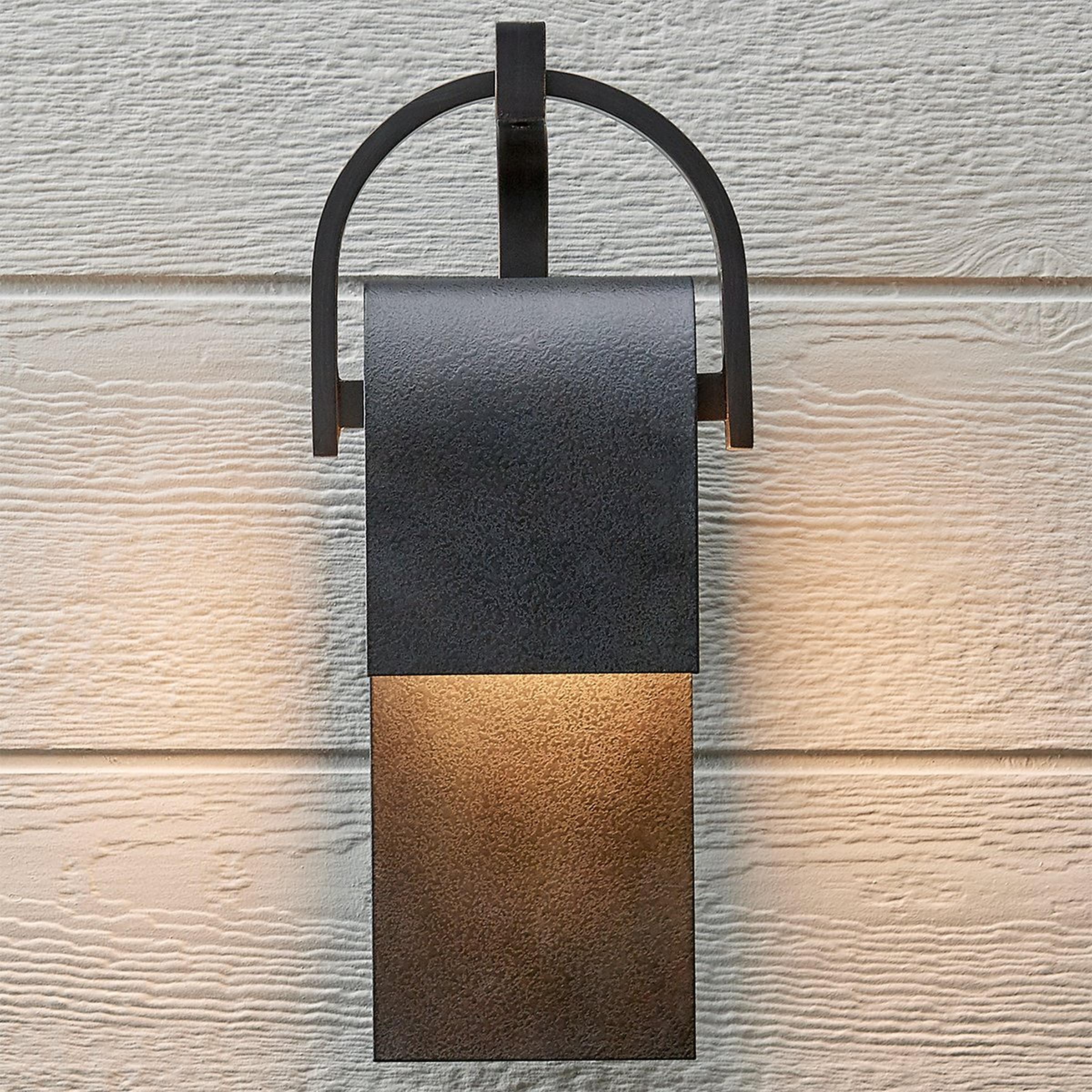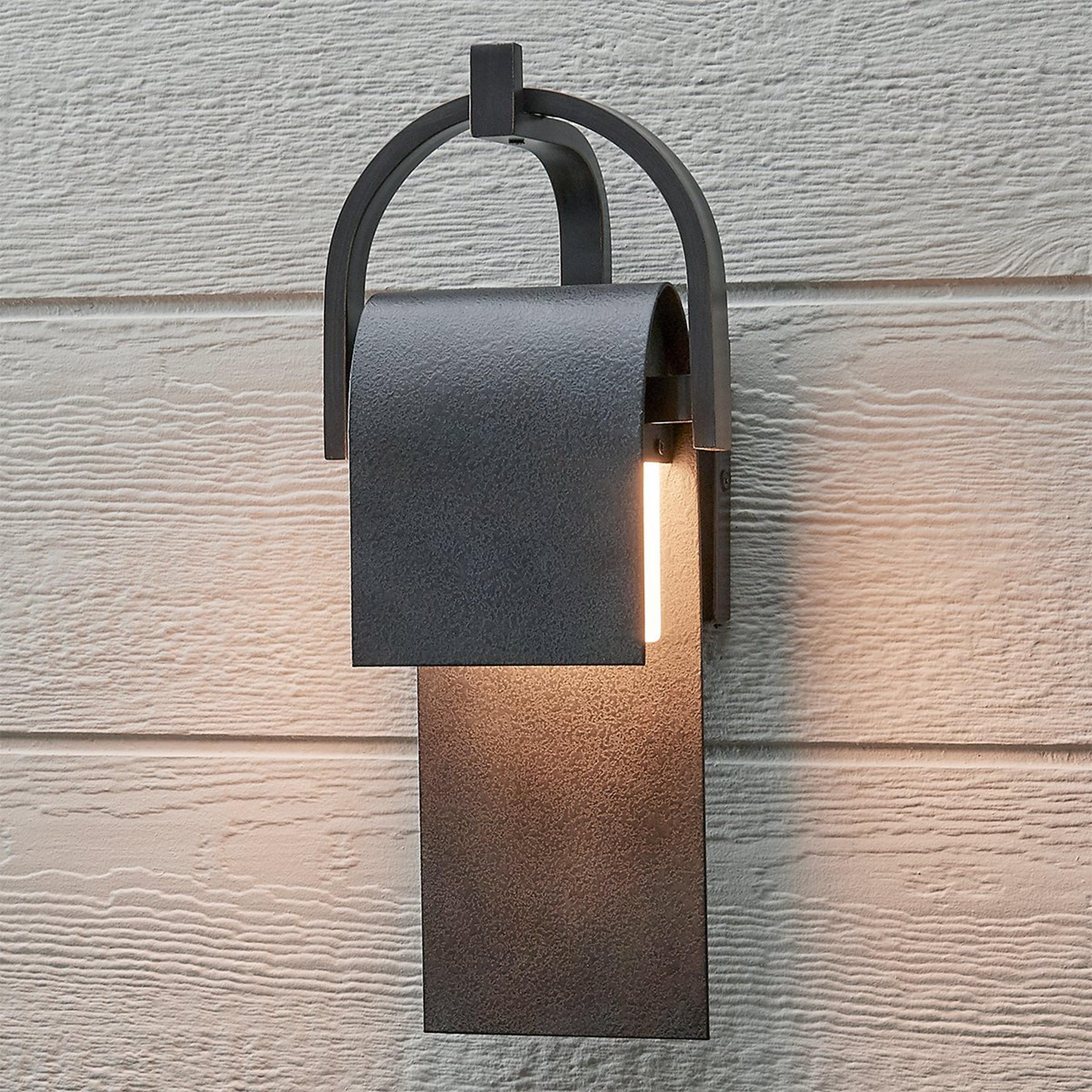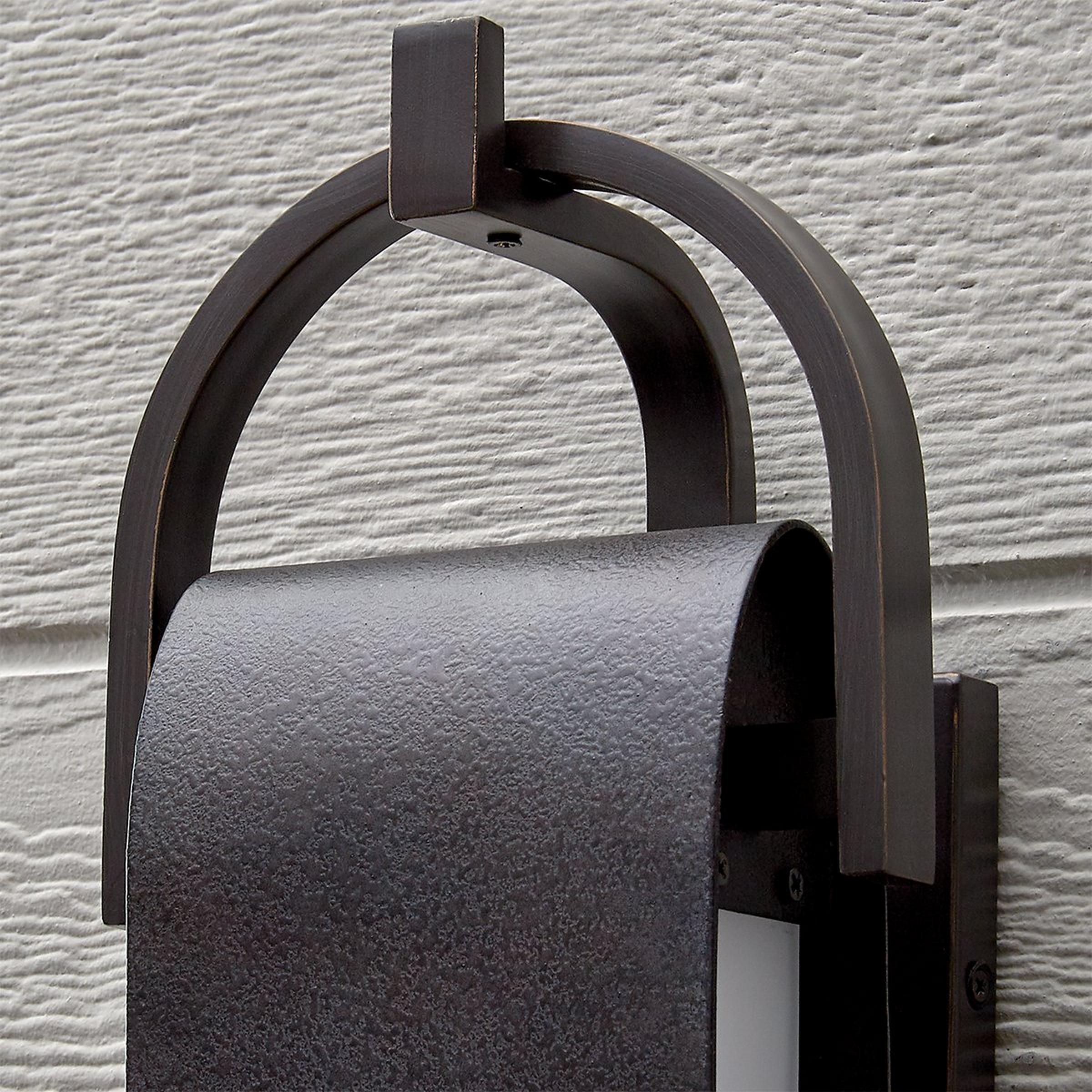 A panel of aluminum is bent forward at the top and cradled by a bracket. A beautiful textured Rustic Forged finish is used in keeping with the pastoral design elements. Cleverly concealed inside the arch is a LED light source which sheds ample light to the surface below without forward glare.