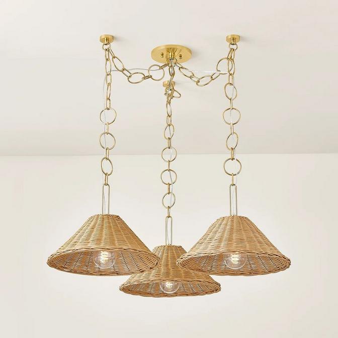 Fabulous and refreshingly versatile, the trio of pendants that form this chandelier can be mounted at a variety of positions and heights to make any space feel bespoke. Spread the canopies broadly over a large dining area, or cluster them together over a more intimate setting; either way, the naturally warm textures will create an inviting space for guests and family. Due to the natural materials used, each piece is unique and may vary in tone.