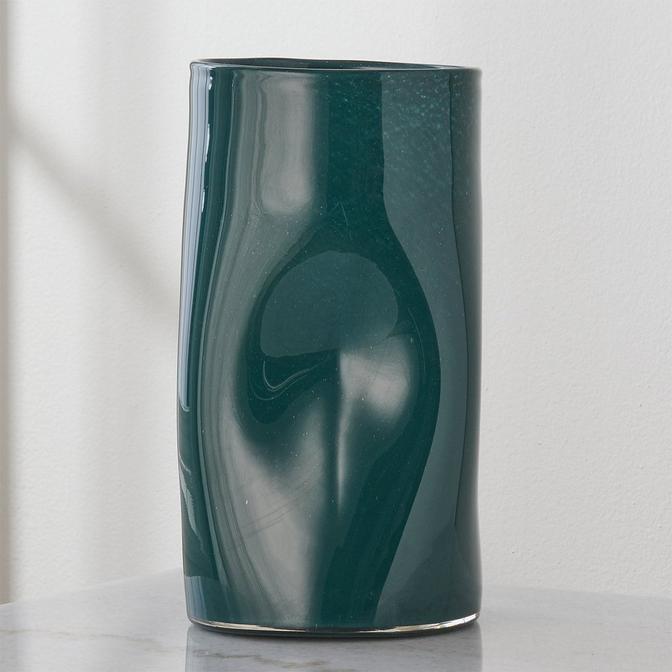Made of colored glass, this unique vase is understated but unconventional. Its cylindrical shape is playfully accented by amorphous dimples for an organic look, adding a subtle, avant-garde accent to your space.