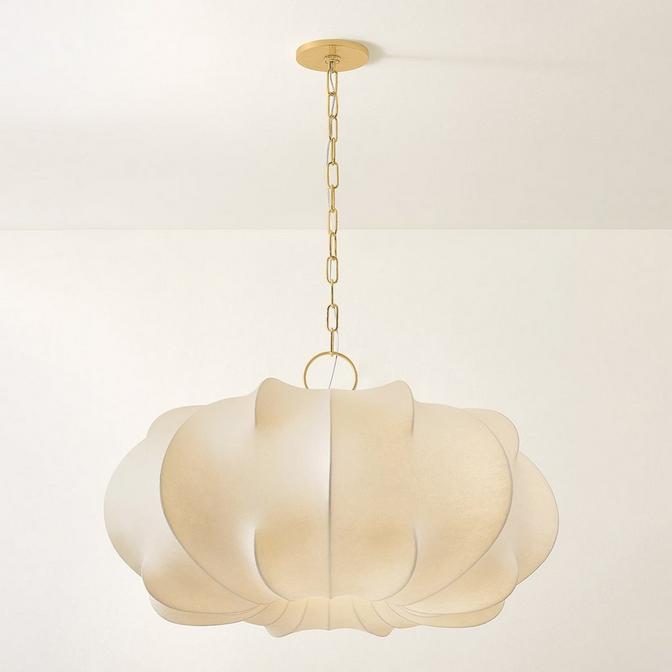 This pendant hangs in space from a decorative, dainty chain and appears to float buoyantly due to its voluptuous design. An undulating framework, full of movement, becomes a sculptural masterpiece reminiscent of cumulus clouds and hot air balloons as it elevates any room. Subtle details, such as the alternating pattern of the curved frame, transform this fixture into an extraordinary masterpiece. The synthetic fabric stretched across the frame diffuses bright light into a warm, even glow as it glamorizes any dining space, front entry, living room, or bedroom.