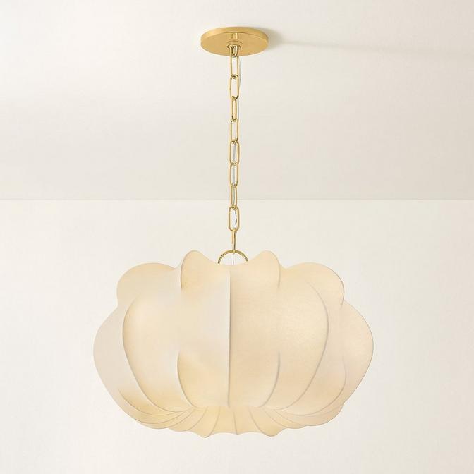 This pendant hangs in space from a decorative, dainty chain and appears to float buoyantly due to its voluptuous design. An undulating framework, full of movement, becomes a sculptural masterpiece reminiscent of cumulus clouds and hot air balloons as it elevates any room. Subtle details, such as the alternating pattern of the curved frame, transform this fixture into an extraordinary masterpiece. The synthetic fabric stretched across the frame diffuses bright light into a warm, even glow as it glamorizes any dining space, front entry, living room, or bedroom.
