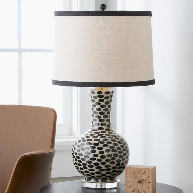 This porcelain table lamp features hand-painted black dots against against a khaki background. Tapered drum burlap shade with a contrasting black trim adds warmth and texture. Acrylic base. Made to order, please allow 4 weeks delivery time.