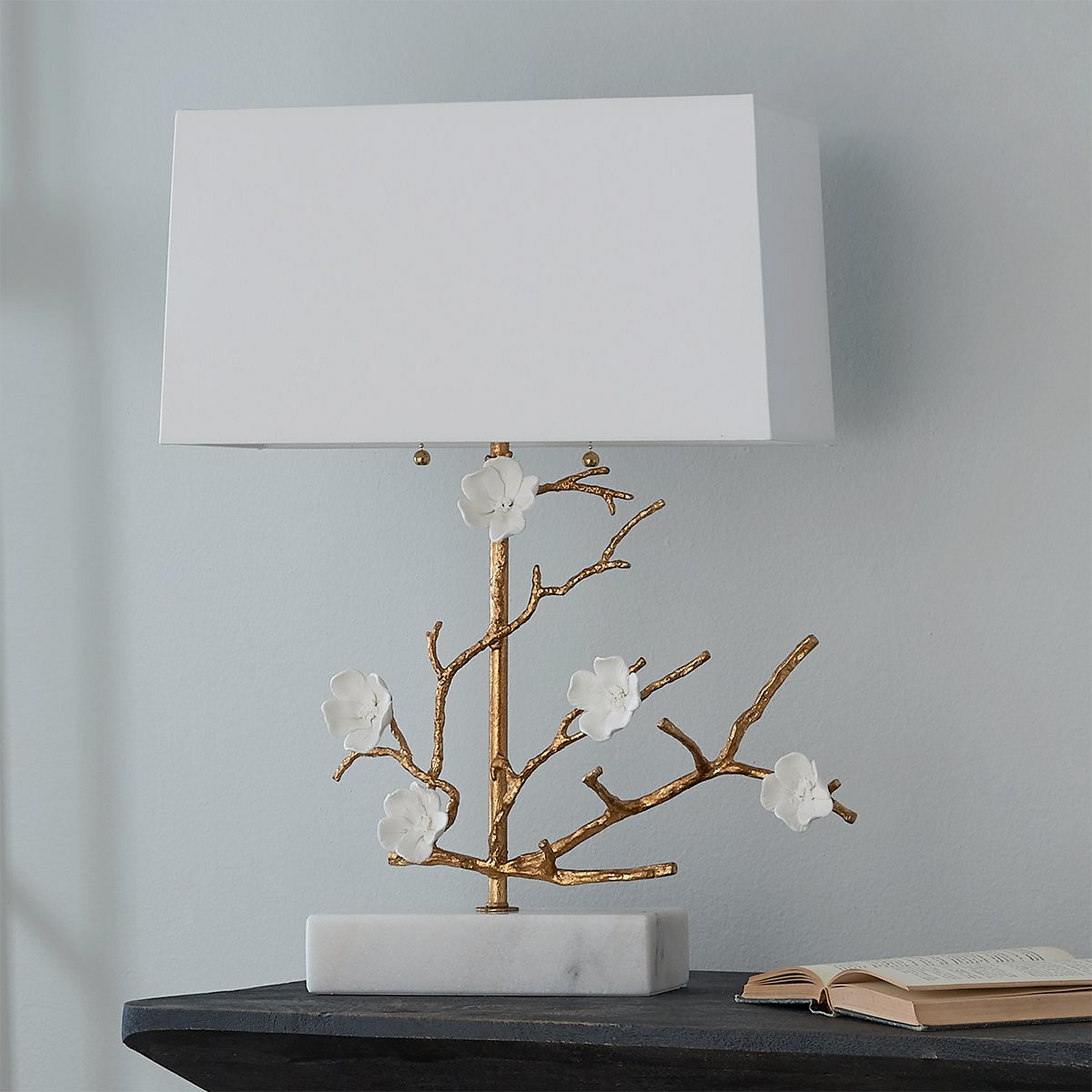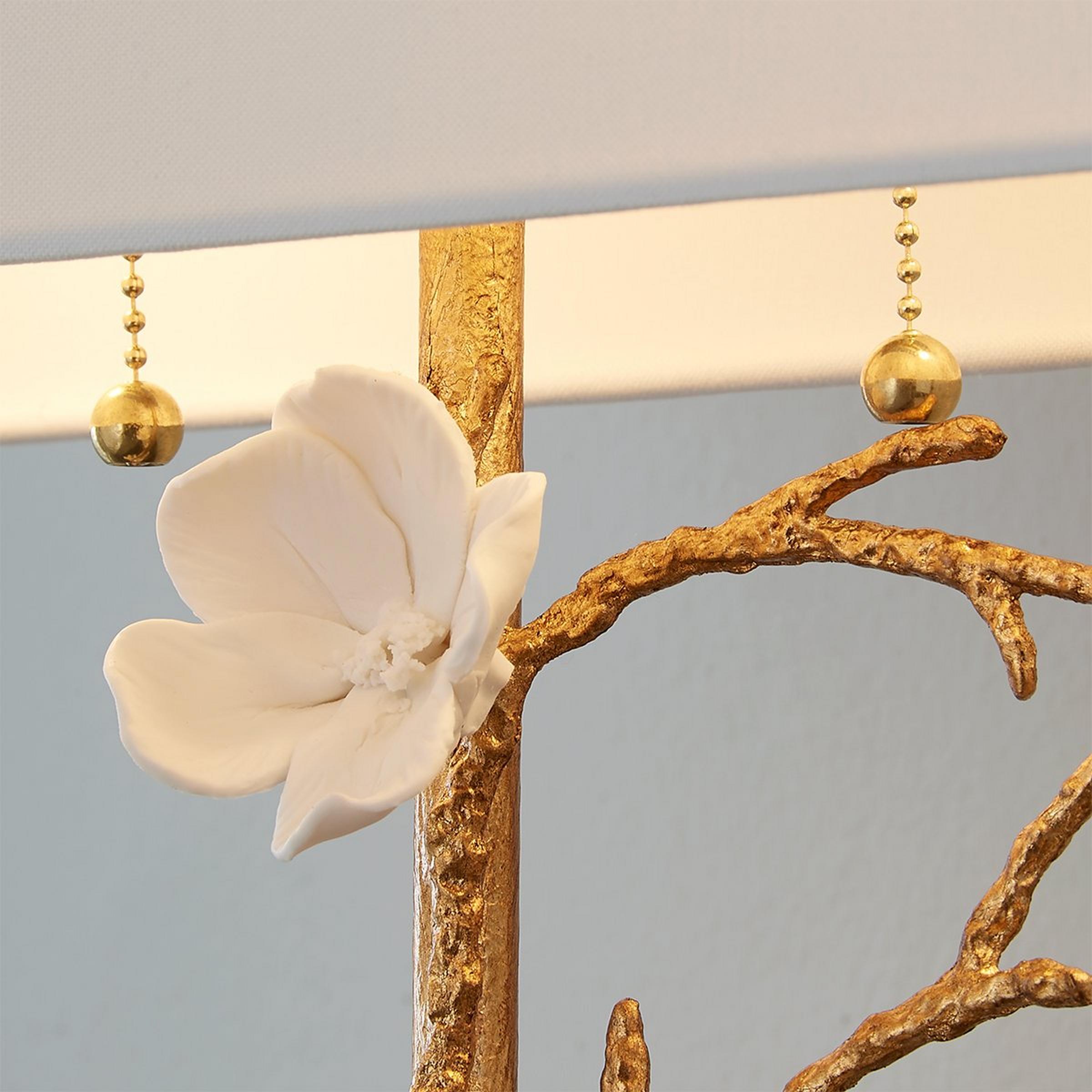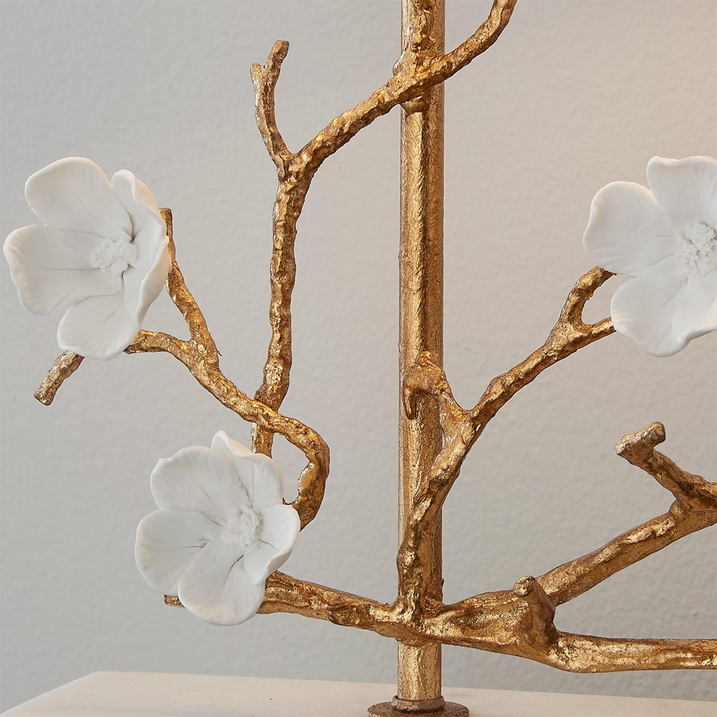 Beauty is reflected in our Blossoming Branch Table Lamp. Its elegant gilded branches are adorned with porcelain blooms, based on white marble to balance the rich materials. The organic design mimics that of nature for a simple yet graceful accessory in your feminine bedroom.