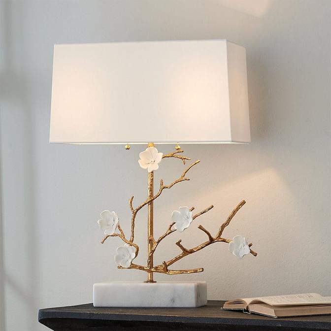 Beauty is reflected in our Blossoming Branch Table Lamp. Its elegant gilded branches are adorned with porcelain blooms, based on white marble to balance the rich materials. The organic design mimics that of nature for a simple yet graceful accessory in your feminine bedroom.